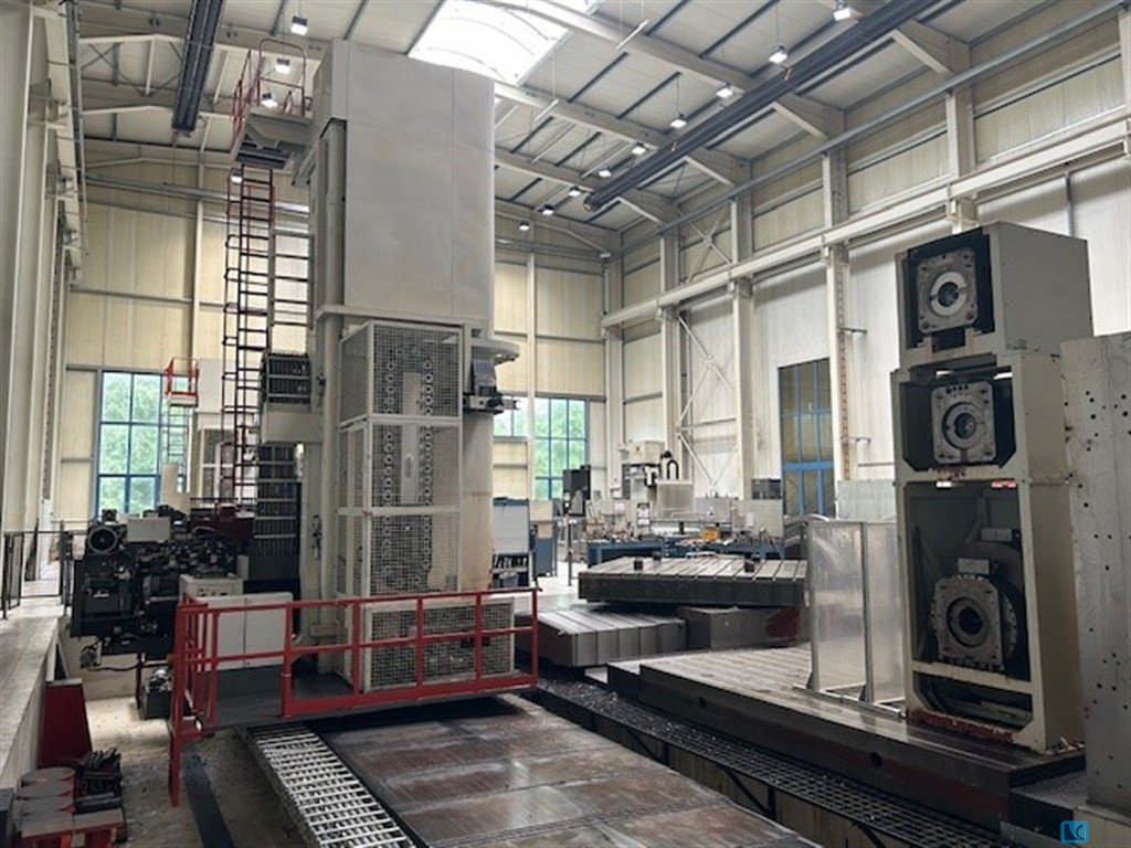 spindle diameter:200 mmx-travel:10000 mmy-travel:4000 mmz-axis:1500 mmW-axis (spindle longitudinal):1000 mmbore spindle turning speed range:1 - 2000 U/mindimension of the ram:600 x 530 mmhigh speed spindle taper ISO:60/50 rapid motion - x-axis:8000 mm/minrapid motion - y-axis:8000 mm/minrapid traverse Z-axis:5 m/mintotal power requirement:120 kWweight of the machine ca.:135 tdimensions of the machine ca.:16,0 x 5,0 x 10,0 mwith CNC Steuerung HEIDENHAIN iTNC 530hydrostatic guideways x and Y- axisautom. toolchanger 40-pocketsautom. Pickup Station for angular milling head, universal milling head and facing headrotary table 3000 x 3000 mm , max load 60 to.v-axis 2500 mmchip conveyor and coolant attachment