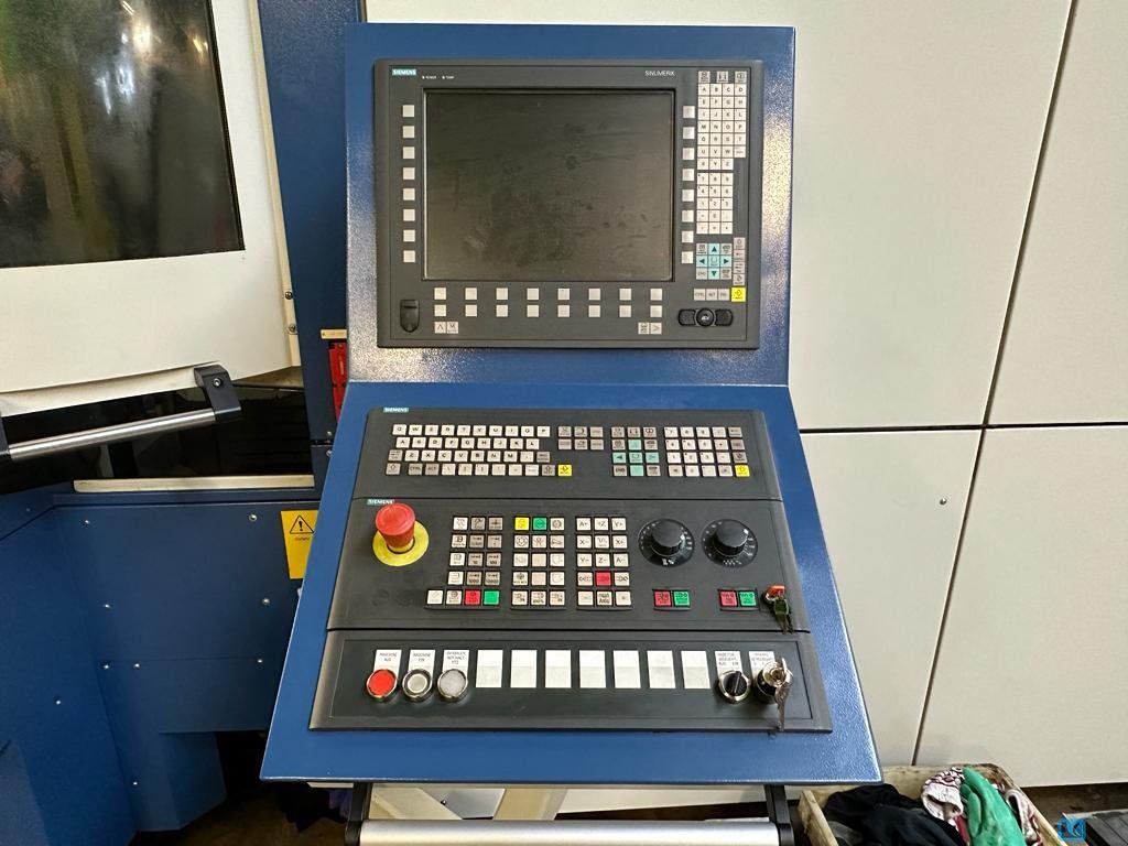 spindle speed::max. 12000 tool taper:HSK 80 .b-axis:360 x 0,001 °worktool support (A-axis):+40 / -95 °weight of the machine ca.:25 500 Kgs.x-travel:800 mmy-travel:700 mmz-travel:630 mmdimensions of the machine ca.:6200 x 3000 x 3200 mmpallet size::500 x 500 mmno. of tools in the magazine:61 Nos.Weight approx.:23,5 tHorizontal Machining Center with CNC Control System SIEMENS 840 C in well maintained condition.Single spindle