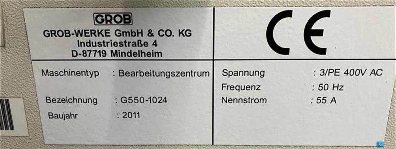 x-travel:800 mmy-travel:950 mmz-travel:1020 mmweight of the machine ca.:17 tdimensions of the machine ca.:6 x 3 x 3,2 mDiameter of the table:770 mmmax. table load:800 kgtool taper:HSK-A63 max. tool length:465 mmno. of tools in magazin:60 spindle turning speed range:12.000 U/minfeed power:8 kN kppower capacity:25/35 kW5 axisG550-1024 HSK A-63Grob (Bezeichnung G550-1024): 4529h1 spindle