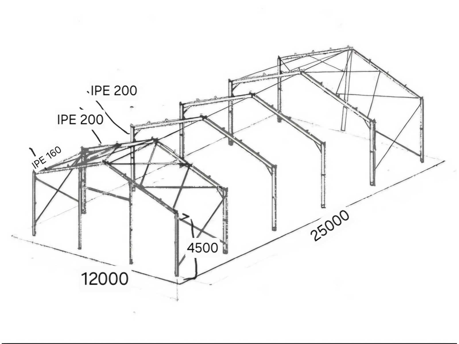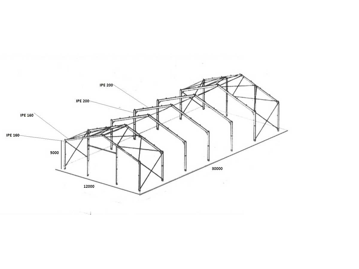 LOT 4 Type: Industrial metal hall Material: Steel Year of construction: 2026 Total area: 300 sq m Overall size (1): L 12000 mm Overall size (2): L 25000 mm Gutter height: 4500 mm Ridge height: 6000 mm Additional information: Roof slope: 20 degrees; Painted RAI 5023; The structure consists of: 2 beams (trusses) on the ends from IPE 160 profile; 4 intermediate beams (trusses) from IPE 200 profile; 4 end posts from IPE 160 profile; 8 intermediate posts from IPE 200 profile; 3 door posts from square pipe 100x100x4; 5 pressure uprights from 76x4 pipe; wind bracing for beams and posts made of galvanized steel with 16 mm tensioner; The entire structure is assembled with bolts (demountable); Condition: unused; The structure includes Certificate of Conformity for materials, construction sketch, and foundation plan; Auction-ID: A7-45215-4