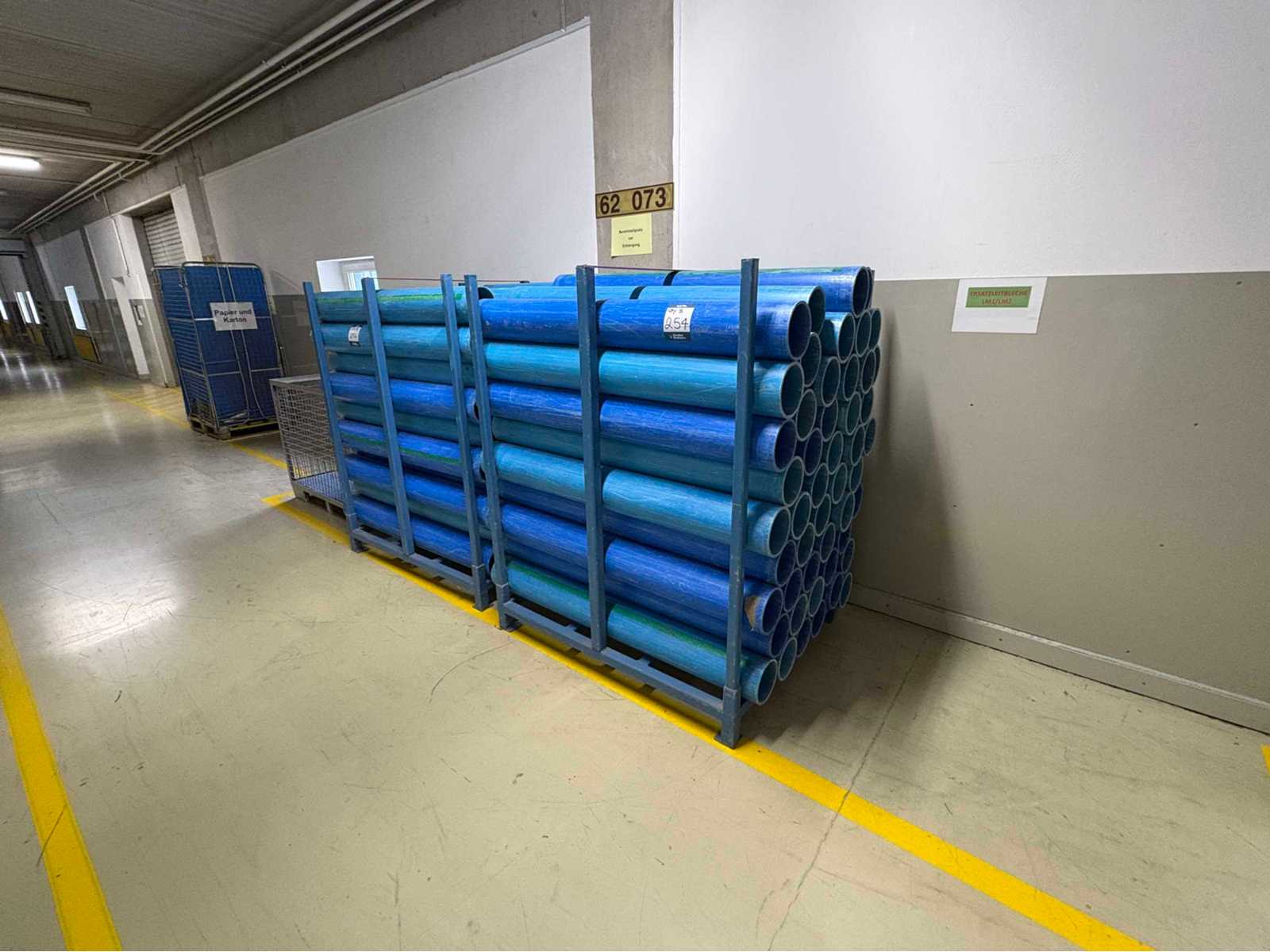 Eight steel pipe storage stillages include approx. 280 blue plastic pipes approx. size of each pipe. 1.45m long, OD 170mm, ID 152mm Auction-ID: A1-45187-254