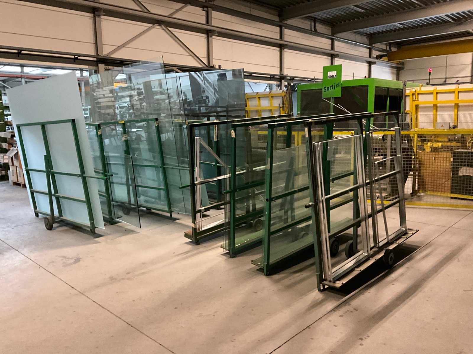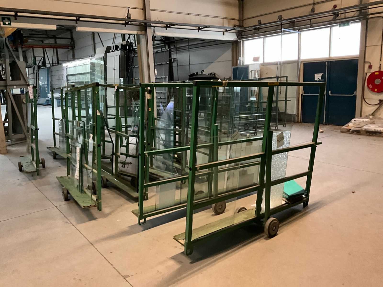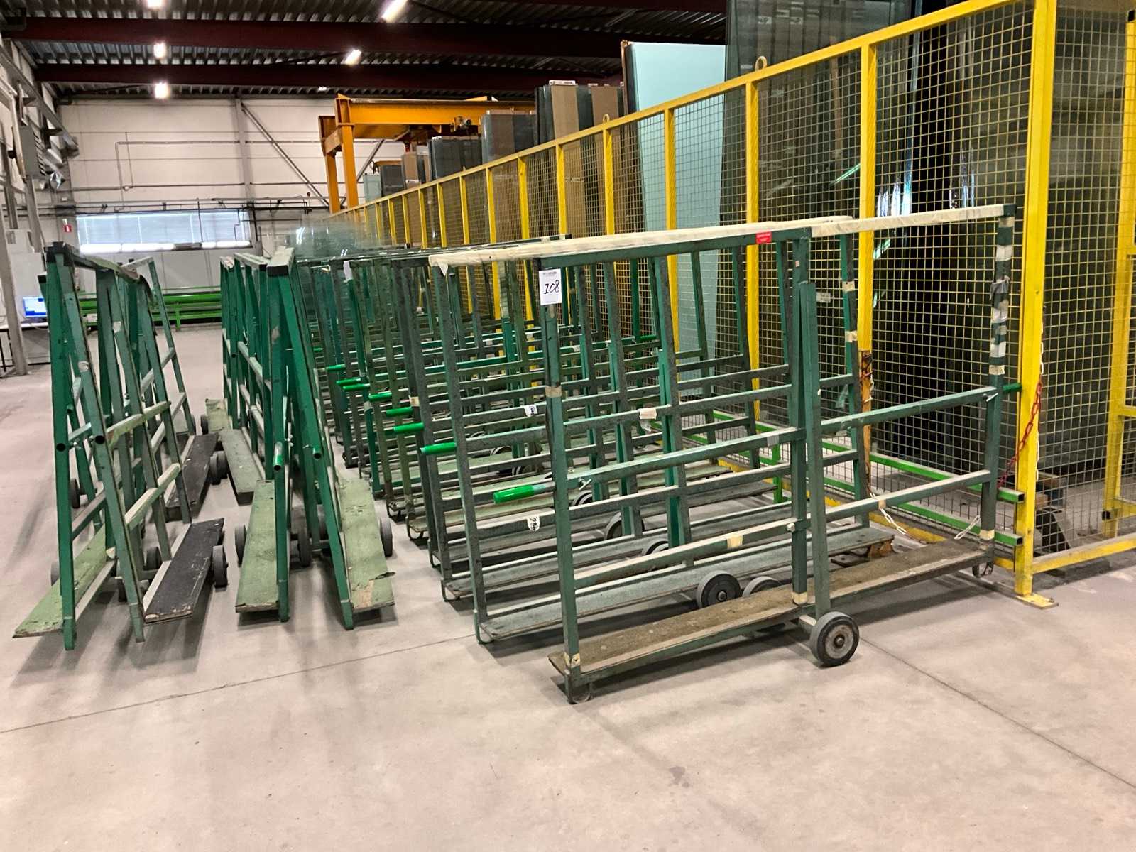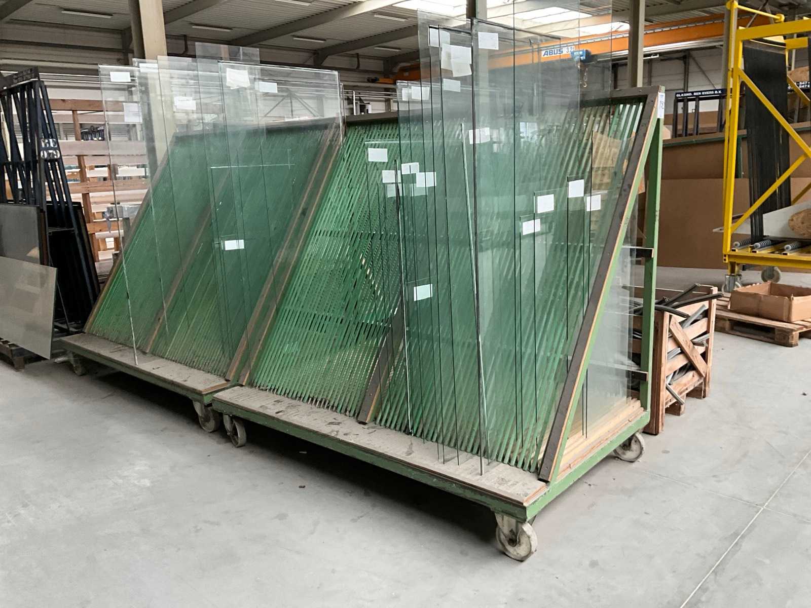 Steel frame with 2 wheels, 3 carts with glass, contents included with Auction-ID: A1-44279-108