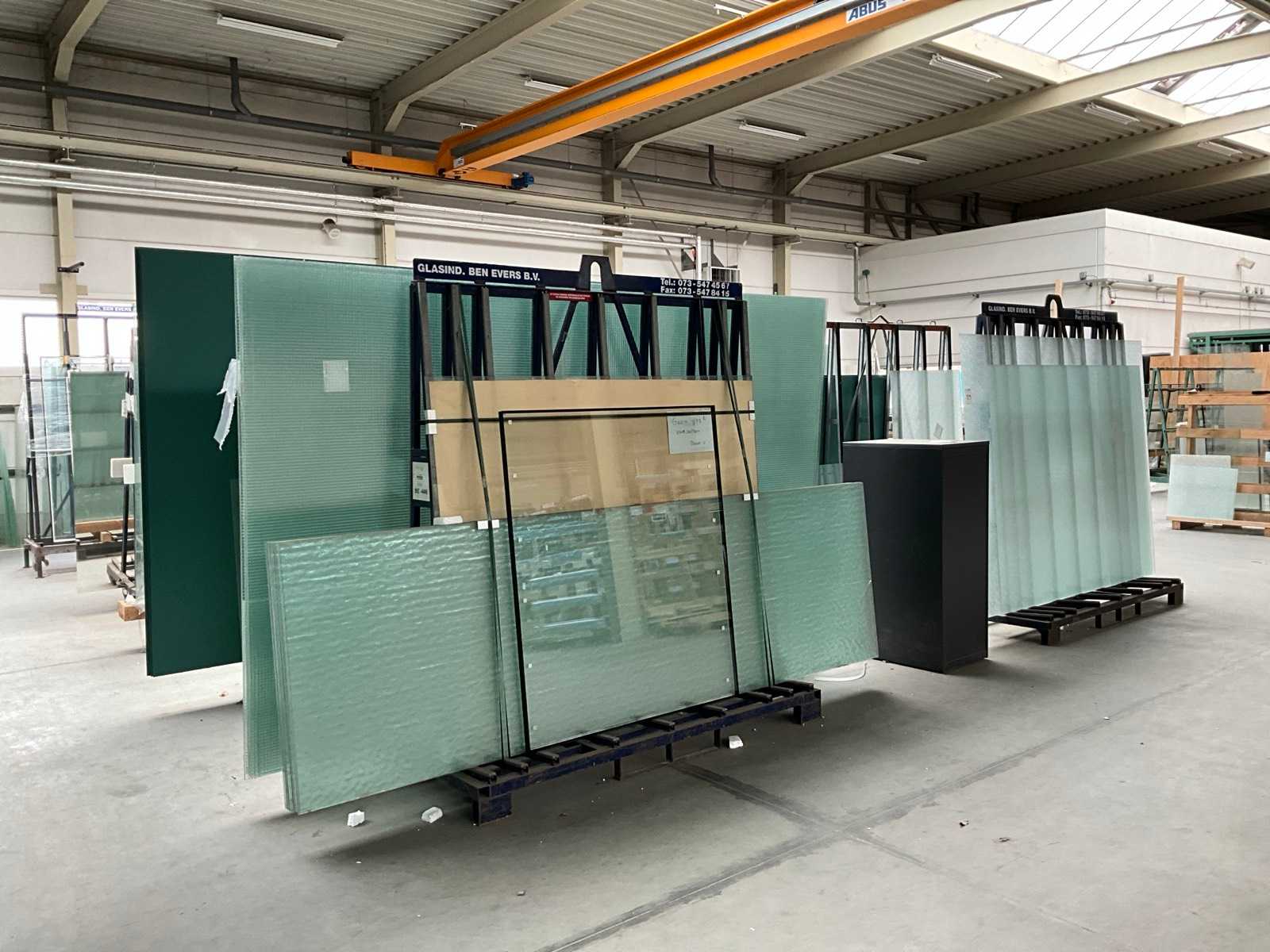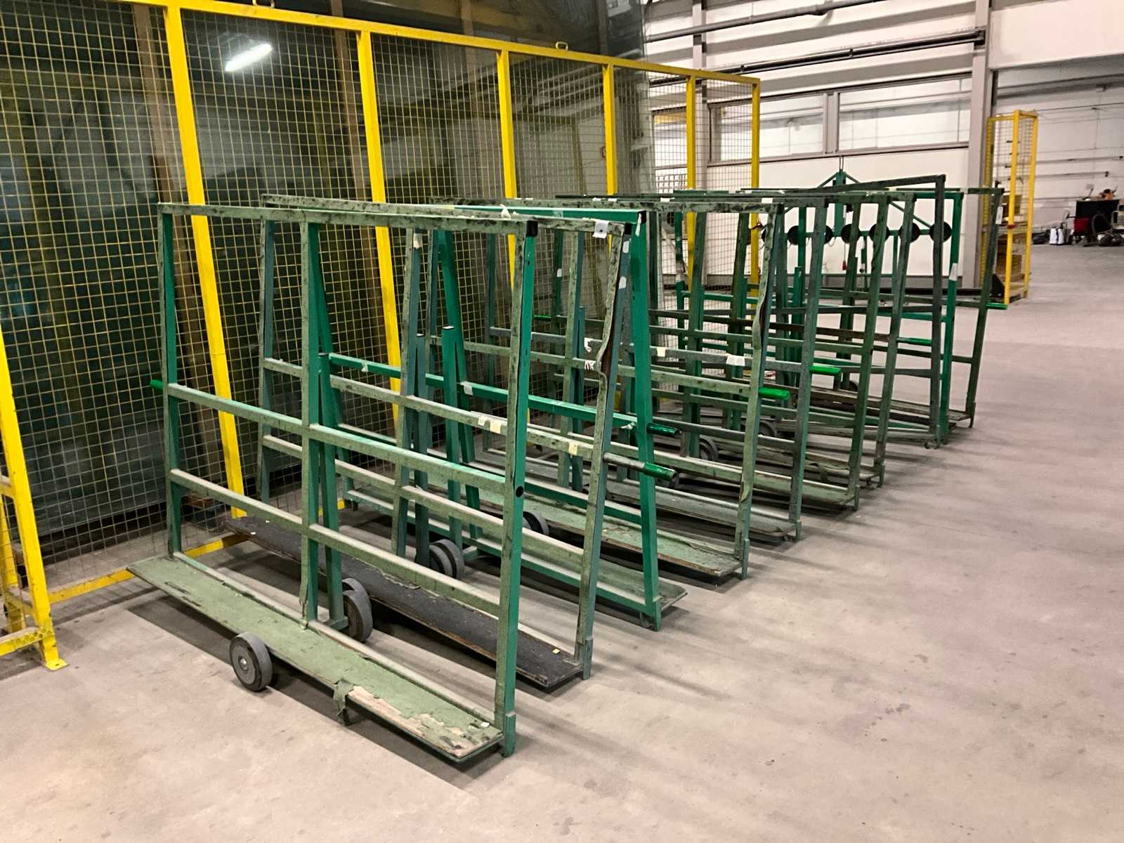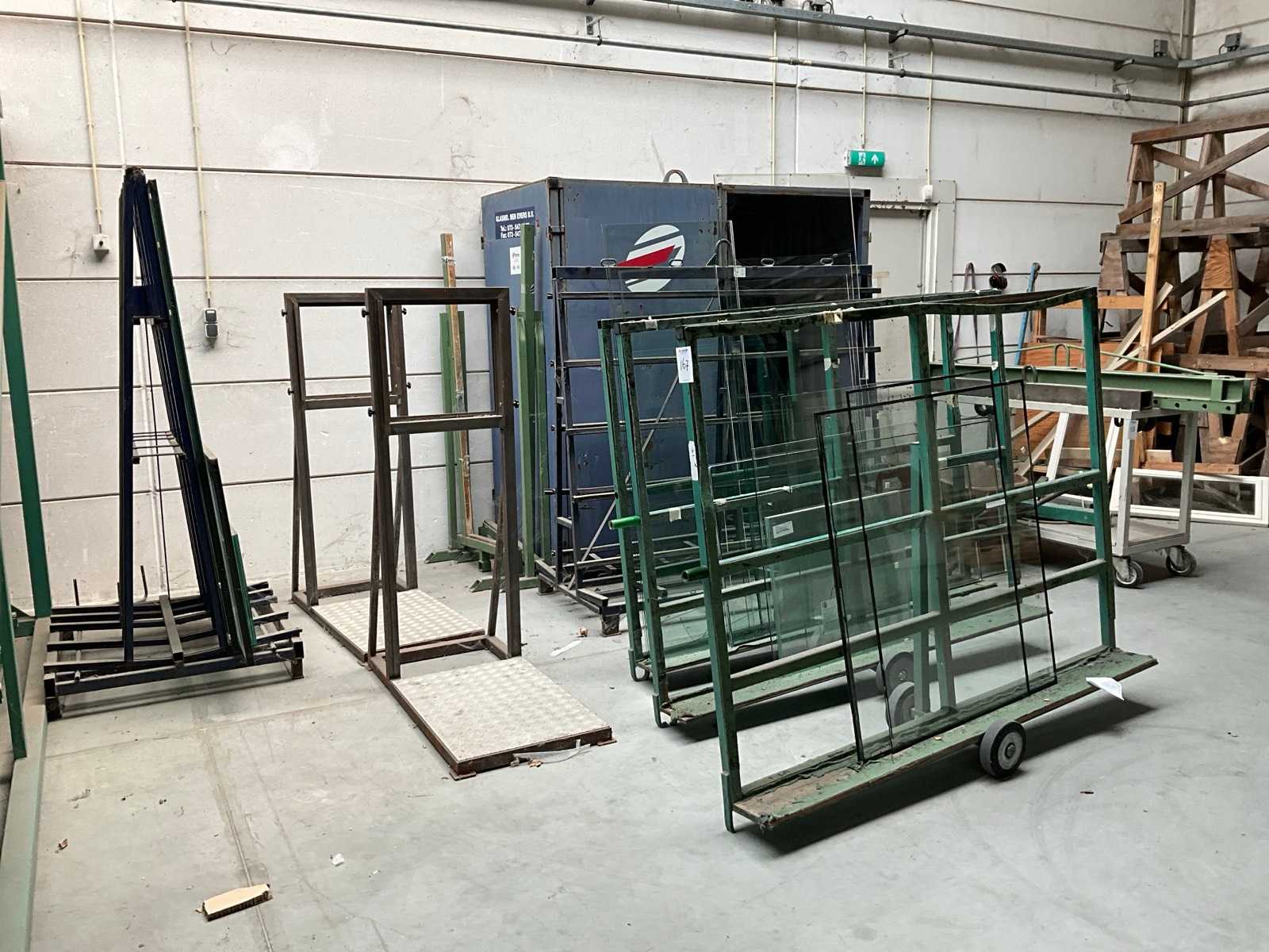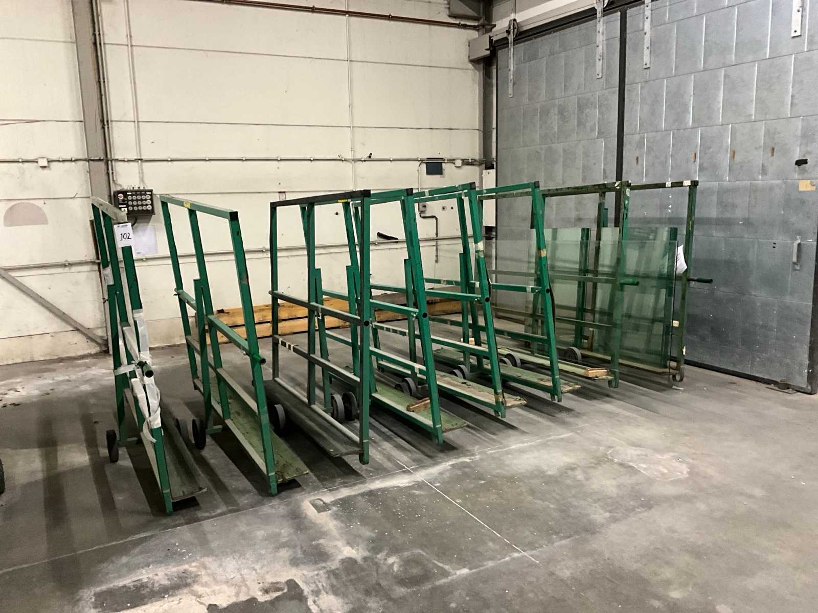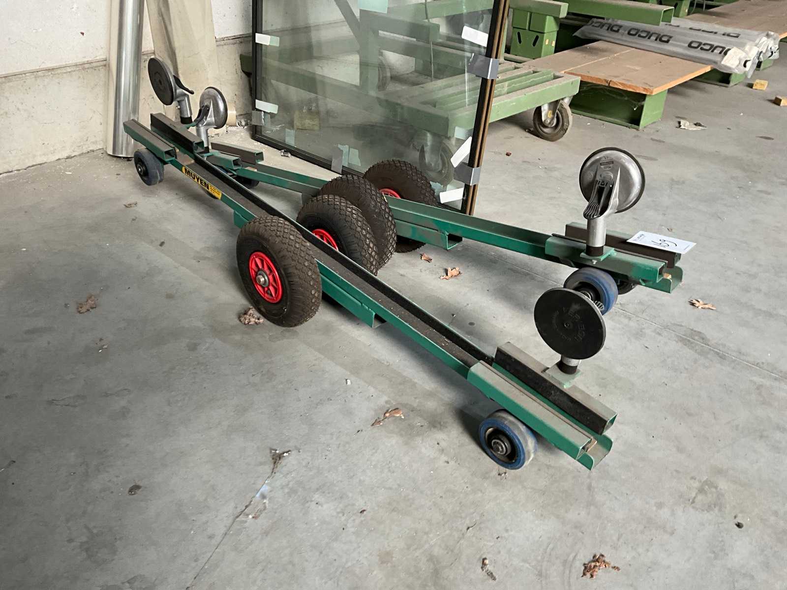Steel frame with 2 wheels, 3 carts with glass, contents included with Auction-ID: A1-44279-108