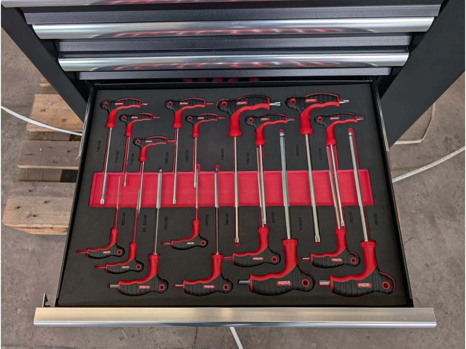 Professional tool trolley with a 280 pcs set of tools. Max cart load 475 kg, max drawer load 35 kg. 7 drawers with centralized keylock. 5x drawers 525 x 395 x 90 mm. 2x drawers 525 x 395 x 132 mm. 1x side cabinet with keylock. 2x tilting wheels. 2x braking wheels. 1x cart handle. Shipping dimensions 830 x 520 x 870 mm - 86 kg. Assembled dimensions 758 x 456 x 967 mm - 77 kg. Machine condition: unchecked. Approx. Transport dimension: LxWxH 830 x 520 x 870 mm; Approx. Weight: 86kg The item for sale may not be the one shown in pictures, but will have equal specifications and performance. Auction-ID: A7-43155-456