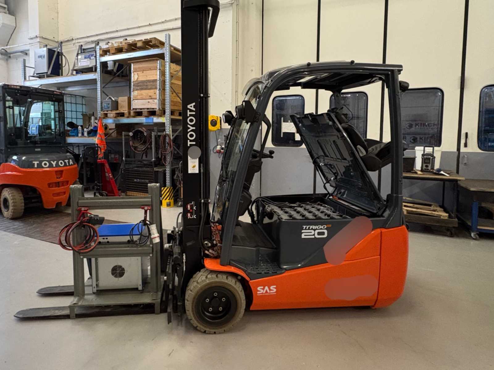 Vehicle data Manufacturer: Toyota Type: 8FBE20T Type: Electric 3 wheel forklift Drive type: Electric Load capacity: 2000 kg Year of manufacture: 2023 Hours: 65 Length: 1988 mm Overall width: 1152 mm Net weight: 3953 kg ISO class: ISO class 2 = 1,000 - 2,500 kg Mast data Mast Type: Triplex Lifting height: 7500 mm Overall height: 3200 mm Free lift: 2650 mm Fork length: 1200 mm Fork width: 120 mm Fork thickness: 35 mm Fork Carriage: 920 mm Motor, Battery & Charger Battery: EXIDE, 2023, 48V, 690Ah, 80 - 100% Description & Optional Equipment Front tyres: Superelastic Front Tire Condition: 80 - 100% Rear tires: Superelastic Rear Tire Condition: 80 - 100% Tech. Condition: New Optical Condition: New Facilities Special equipment: - 3rd valve - 4th valve - Front work lights Rear Combination Light, Flat Rearview Mirror, Rear Blue LED, Mini Lever, Multifunction Display Auction-ID: 04F-RYY-1