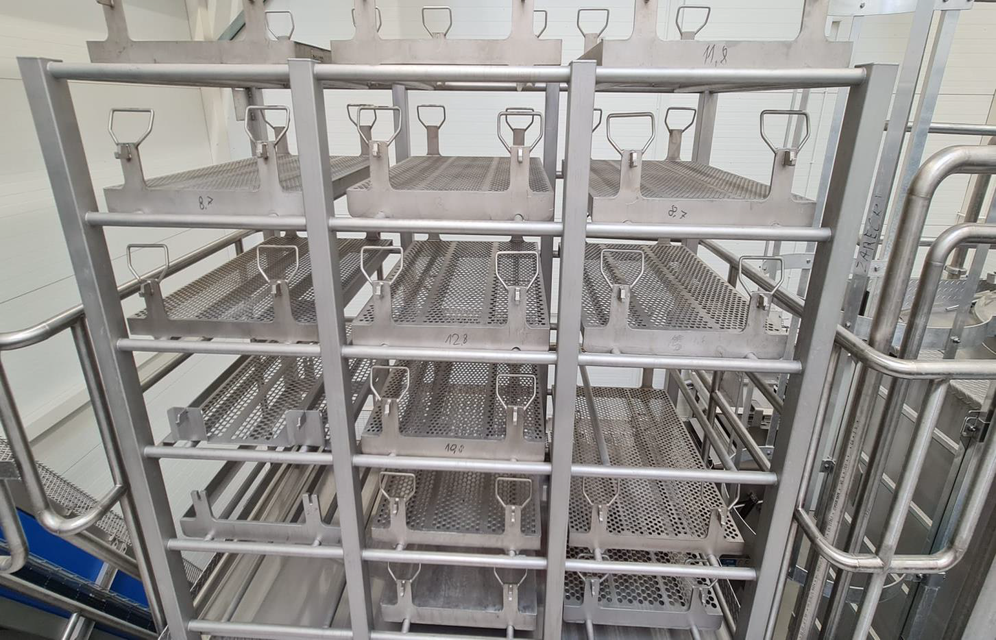 Grinding line for frozen synthesis , Karl Schnell Packed , stored in Europe, ready to ship and install Featured for US CAPACITY Capacity up to 15 000 kg/h for the fresh process Capacity up to 8 000 kg/h for the frozen process Design for three shifts-operations 6 working days/week with 16 working hours/day RAW MATERIEL All raw materials temperature between -18°C and +15°C: - Pork and chicken liver - Pork pulmon - Atum viscera - MDM Max 19 000 cp @ 0°C Content : Pos.015 KS Lifting device DM-1500 type 632 Maximum load capacity: 1500Kg Designed for frozen raw material pallets Fitted with a safety fence Safety fence secured by 2 safety light curtains Pos.020 KS Breaker PB1 type 492 Single shaft breaker for frozen raw materials pallets Maximum height for frozen pallet: 1450mm Pos.085 KS Lifting device DM-800 type 632 Maximum load capacity: 800Kg Designed for Jumbo/ ...