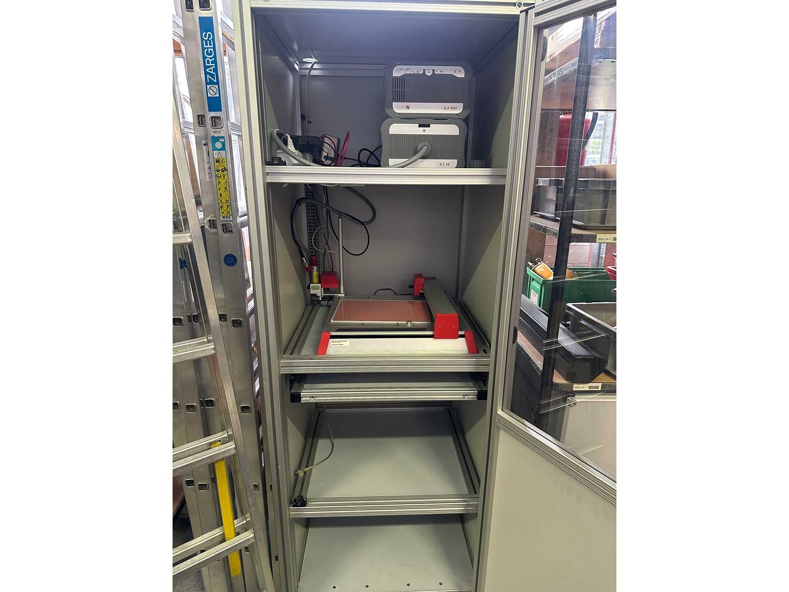 Manufacturer: Murrplastik Systemtechnik GmbH Type: Engraving Labeling Device (Mechanical Engraving, No Laser Technology) Application: - Cable marking - Control cabinets - Nameplates - Controls Technology: Mechanical engraving on plastic and aluminium signs Marking area: 120 × 120 mm Interfaces: USB, Ethernet Input voltage: 100-240 V AC With a lot of residual material. The unit is installed in a trolley made of aluminium profile including extraction. Weight incl. packaging approx. 100kg Auction-ID: A1-45208-3