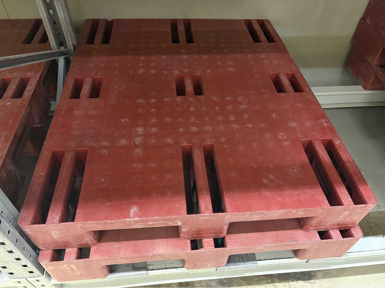 135 x UTZ Group red plastic pallets. Surface load 4000kg when stacked on floor, 1000kg when on forks. Standard 1m x 1.2m x 150mm. Auction-ID: A1-45187-91