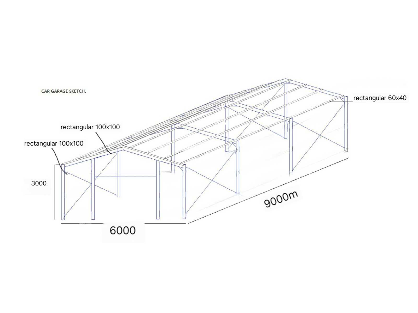 LOT 17 Type: Car garage Material: Steel Year of construction: 2026 Total area: 54 sq m Overall size (1): L 6000 mm Overall size (2): L 9000 mm Height: 3000 mm Additional information: Metal construction; The construction consists of: 4 trusses made of square pipe 100x100; 8 pillars made of square pipe 100x100; 2 supporting pillars made of square pipe 100x100; door crossbar made of U profile 100; connecting wedges made of rectangular pipe 60x40; braces for pillars made of rectangular pipe 30x20; Painted RAL 7032; The construction is assembled with bolts (removable); Condition: unused; The construction includes a certificate of conformity and construction drawing. Auction-ID: A7-45215-17