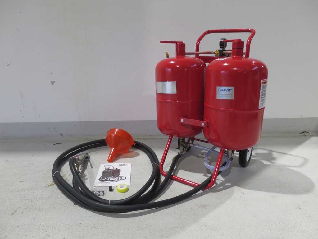 Technical data of the blast pot:Capacity 2 x 37 litres.Length of the hose 2.5 m.Working pressure 4 - 9 barAir consumption Approx. 170 to 500 l / minPackaging dimensions 80 x 80 x 40 cm. Approximate weight. 36 kgVery useful for sandblasting on large outdoor objects. Condition: never used / new (5) Auction-ID: A7-44764-30