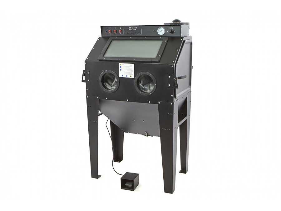 This sandblasting booth is included as standard. Front loader with two gas strutsblast gun4-piece nozzle setset gloves.LightingKit Protective FilmsFoot Pedal.Pressure regulatorsuction with microfilter.Original packagingInternal dimensions 1170 x 880 x 825 mmOperating pressure 8 barDimensions L x W x H 1.33 x 1.24 x 1.7 mMachine weight approx. 0.16 tSystem is delivered in the colour black Condition: never used / new (5) Auction-ID: A7-44764-85