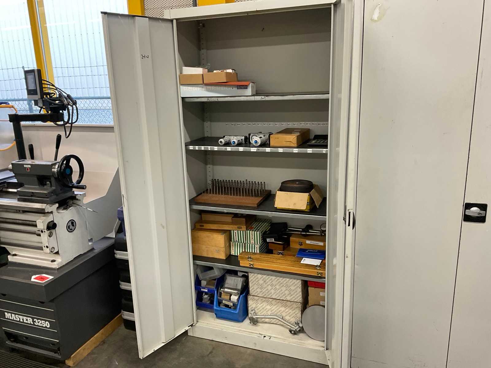 Consisting of, among other things: inner micrometer, hair ruler 0-500 mm, Prisms, refractometer, altimeter, micrometer, calibration caliber for calipers. Cabinet 40x94x195 cm. Auction-ID: A1-43988-9
