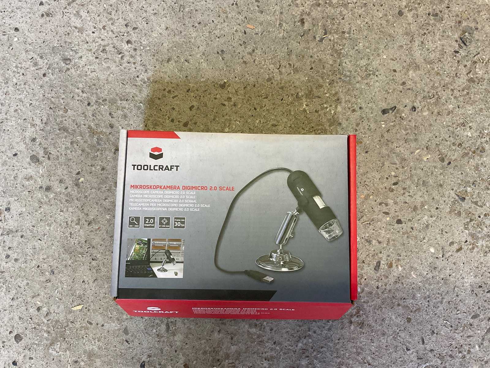 toolcraft Microscope Camera DigiMicro 2.0 / 2.0 Scale – USB Digital Microscope Sell a well-preserved USB digital microscope from toolcraft. Ideal for electronics, quality control, documentation or training. Details: 20–200× magnification 2 MP camera (1600×1200 px) 8 LED lighting Dimensional measurement software (distances, angles, areas) USB port – plug and play Incl. stand, USB cable and calibration ruler Auction-ID: A1-45208-62