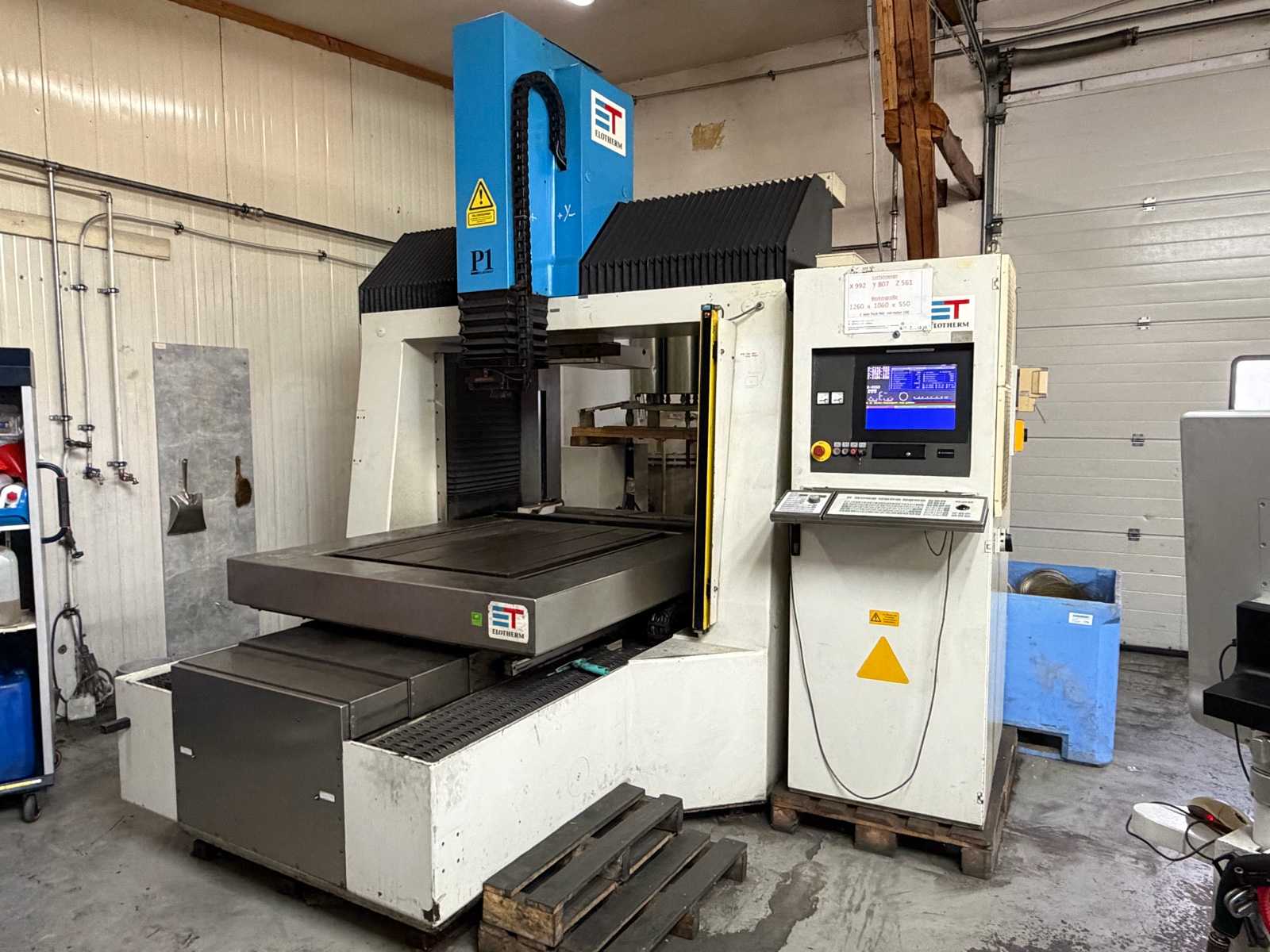 AEG ELOTHERM P1 CNC die-sinking EDM machine. Robust, heavy-duty industrial plant in gantry design with solid casting machine bed and large working area. Generous basin dimensions for machining large workpieces in tool and mould making. Stable work table with T-slots for picking up heavy molds and dies. Equipped with original ELO/AEG CNC control as well as classic pulse generator. Final drives via servo drives. Control cabinet fully stocked. Dielectric system with several pumps and central filter unit. Machine was in use with 72180h until the end. Signs of wear due to age present. Solid mechanical substance, suitable for applications in large-scale mold making and one-off production. Auction-ID: 04D-XCJ-2