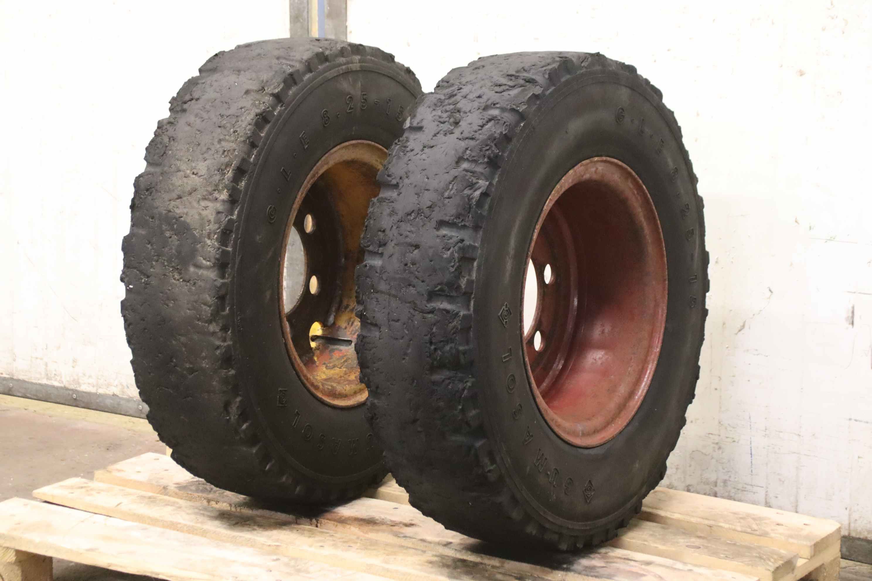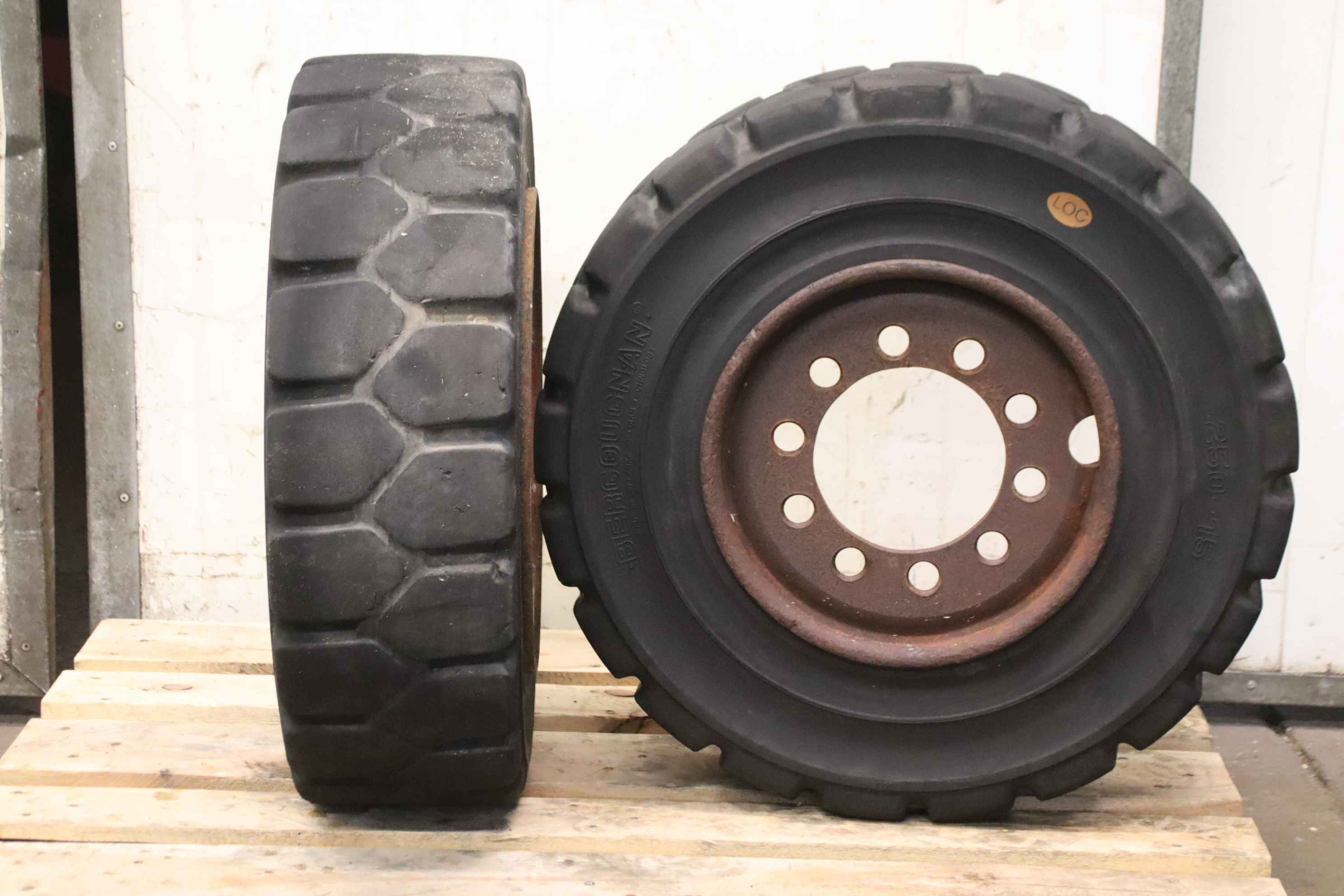 Tires, solid rubber tires, forklift tires, complete wheels-Manufacturer: Bergougnan, solid rubber tires 2 pieces-Tire size: 250-15 RIM 7.00F-15-Bolt circle: Ø 225 x 28 mm-Recess: Ø 175 mm-Price/Delivery: complete-Dimensions each: Ø 700 x 215 mm-Weight: 90 kg/piece