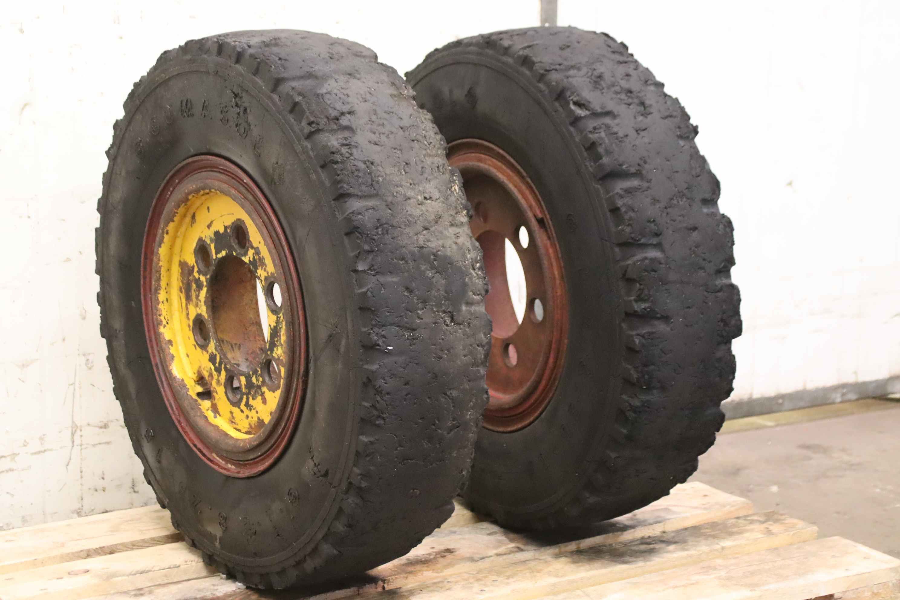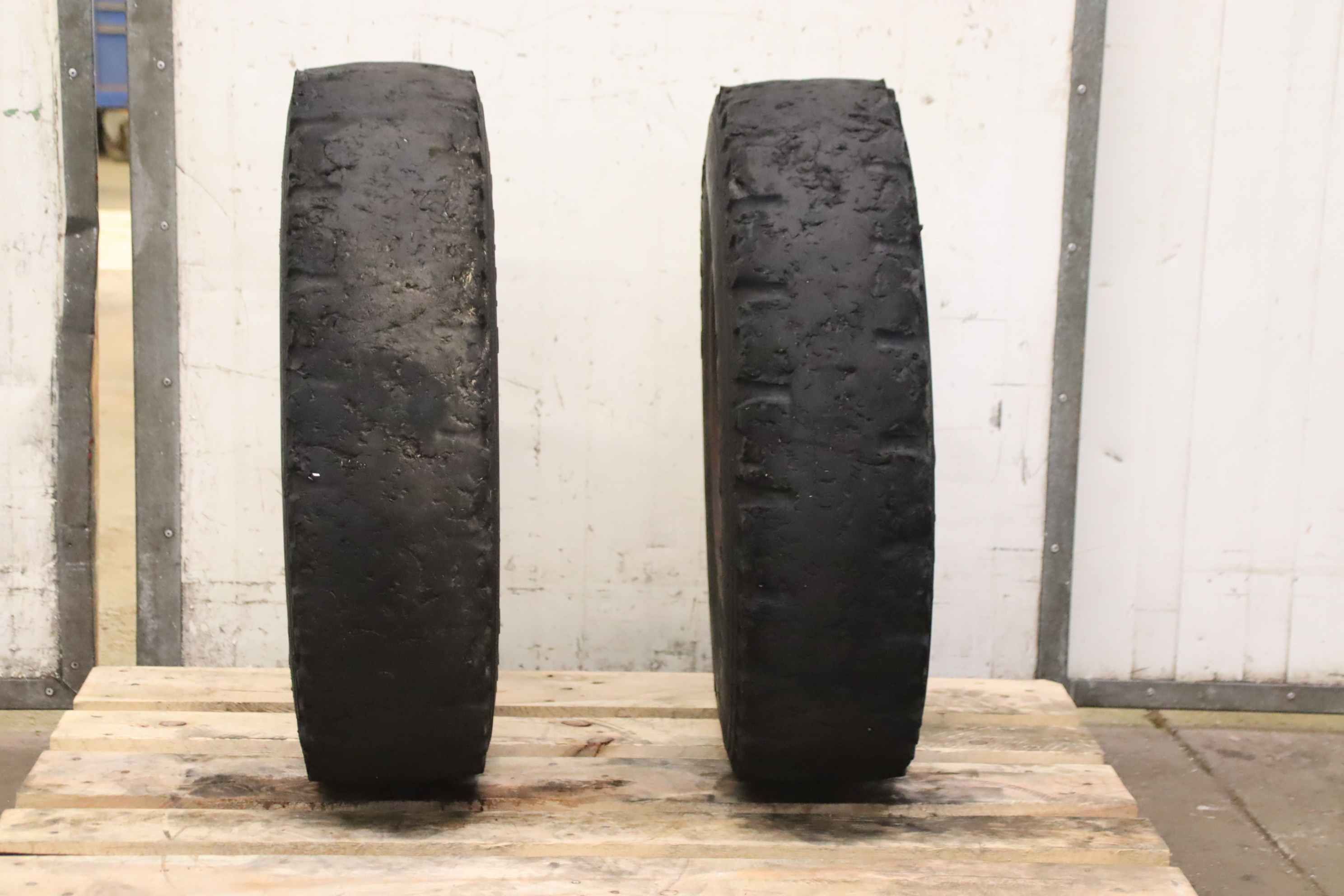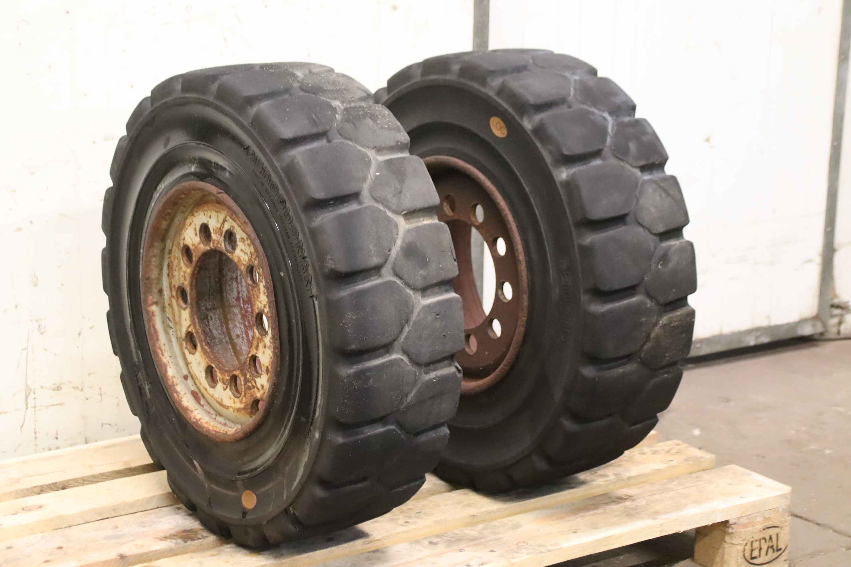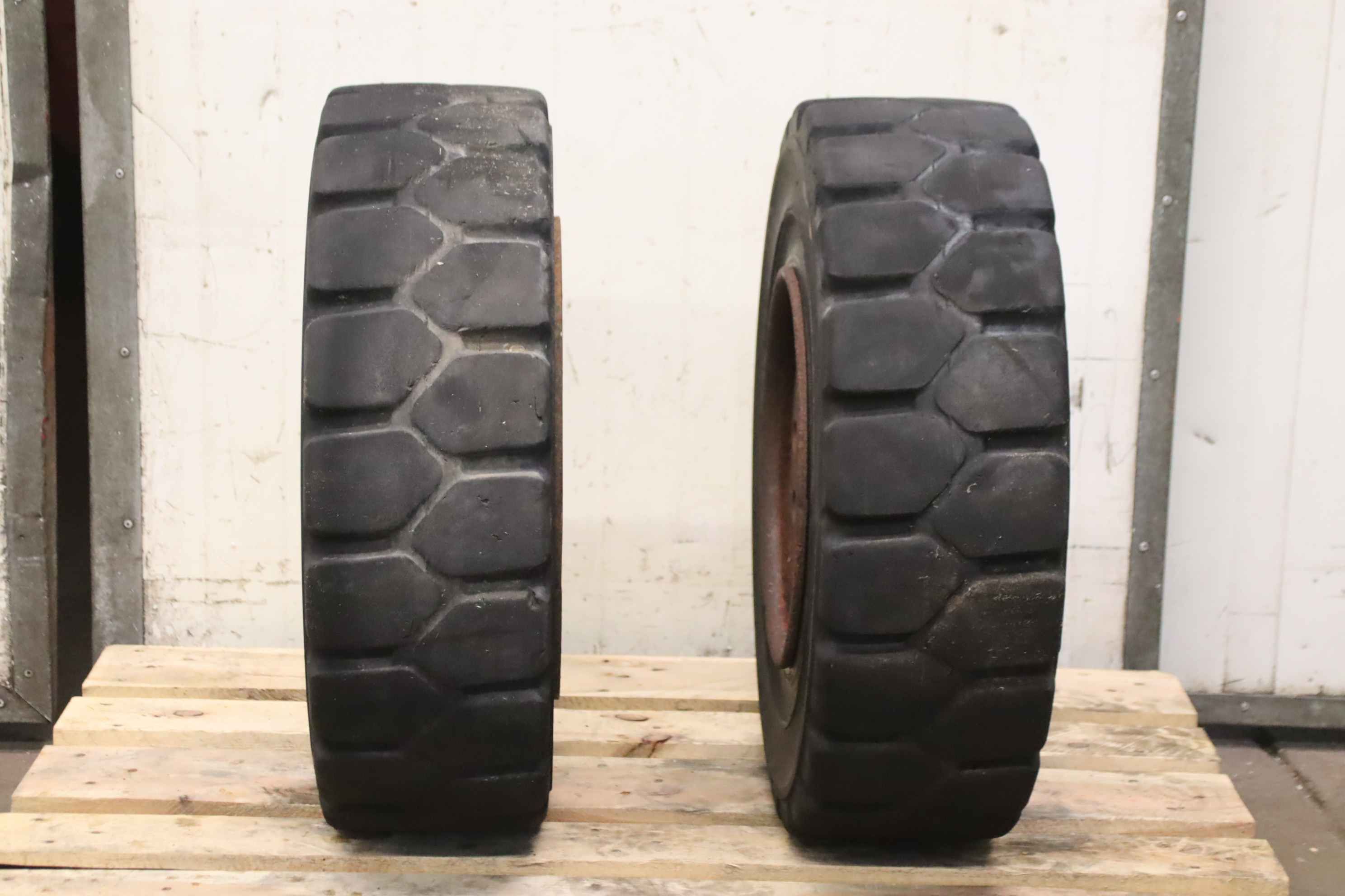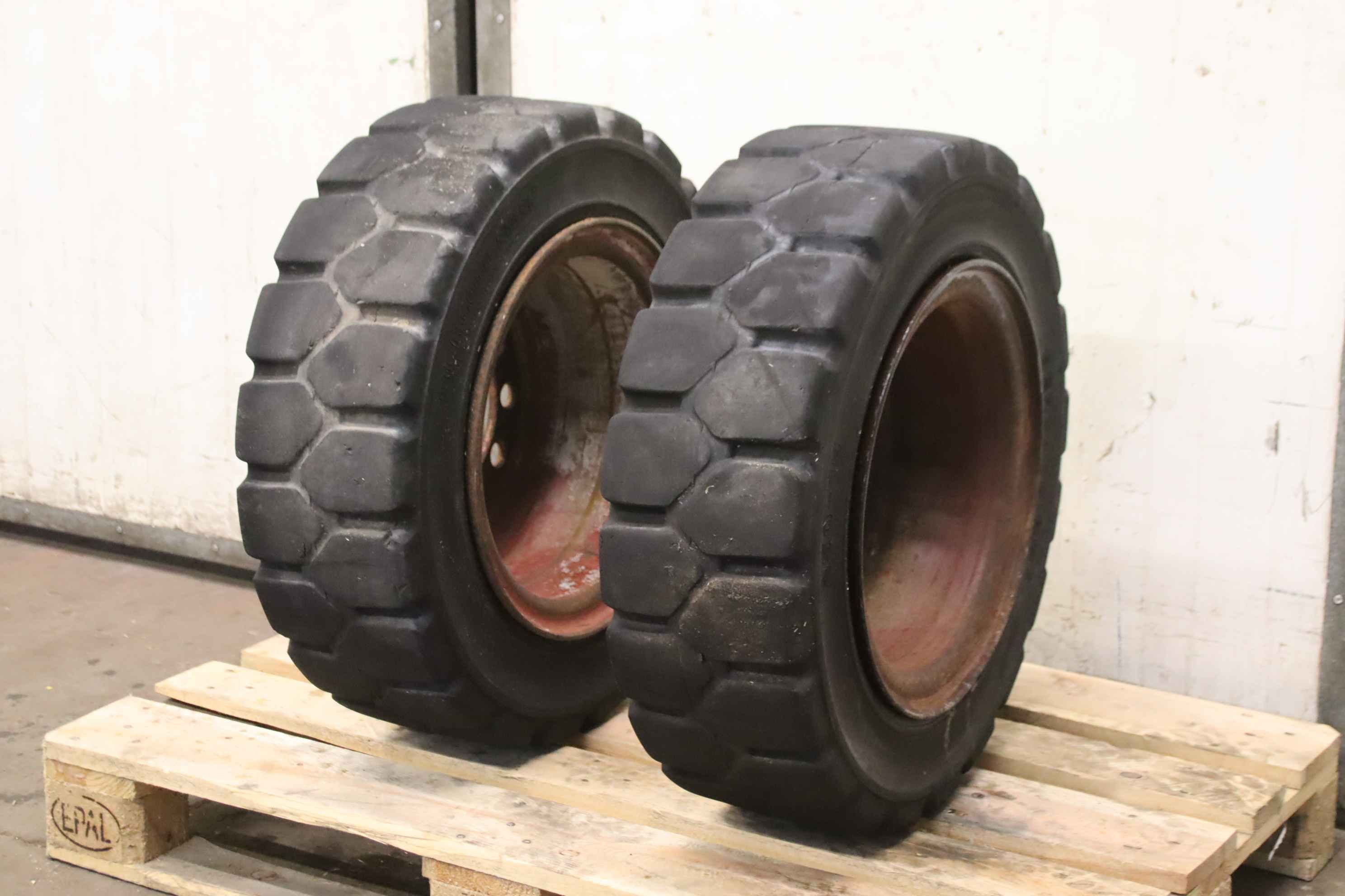 Tires, solid rubber tires, forklift tires, complete wheels-Manufacturer: Vorwerk Rota, solid rubber tires 2 pieces-Tire size: 23x9-10 (225/75-10) RIM 6.50 F-10-Bolt circle: Ø 162 x 20 mm-Recess: Ø 110 mm-Price/Delivery: complete-Dimensions each: Ø 525 x 220 mm-Weight: 49 kg/piece
