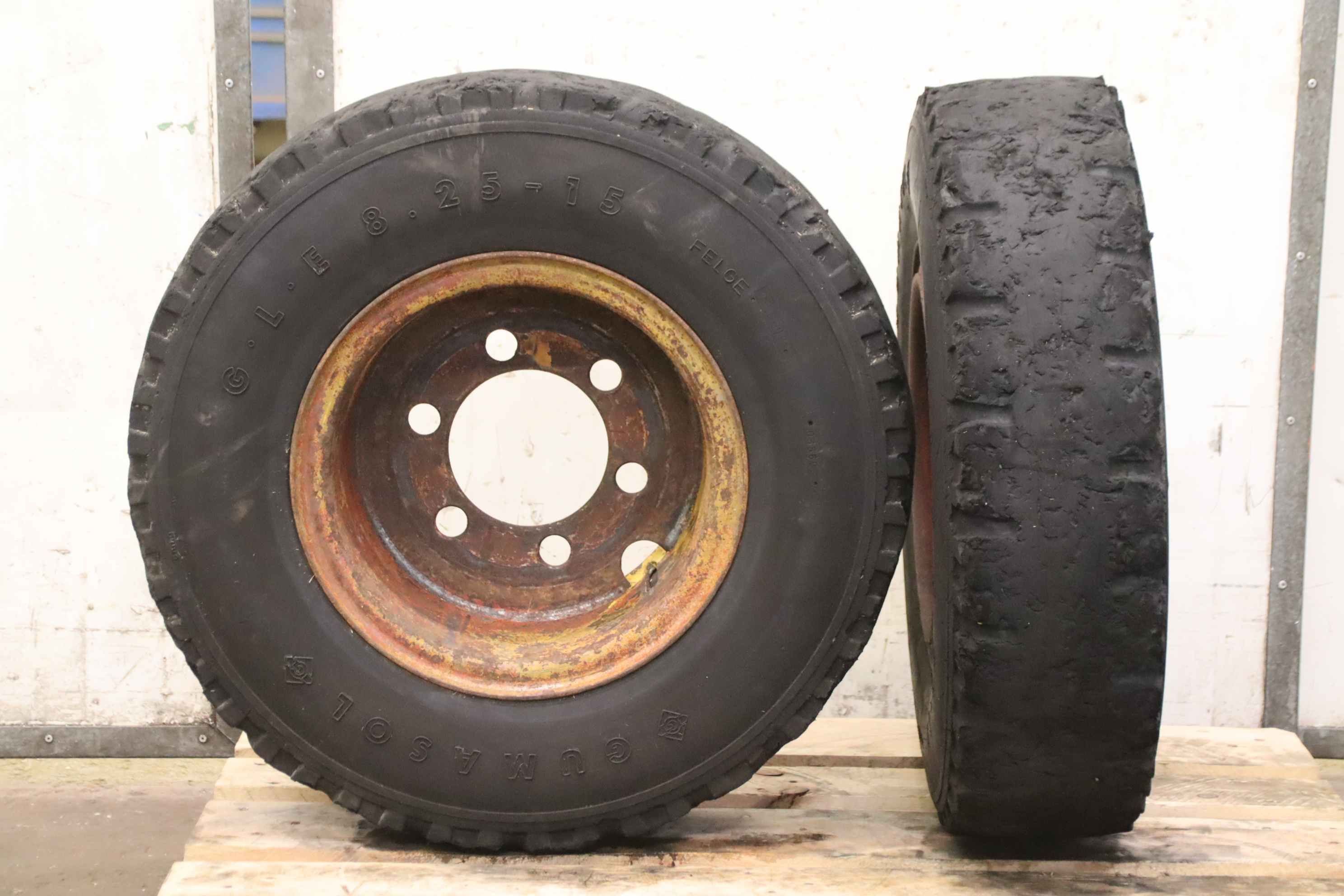 tires, solid rubber tires, forklift tires-Manufacturer: Gumasol, solid rubber tires type GLE 2 pieces-Tire size: 8.25-15-Rim: 6.0-15-Bolt circle: Ø 225 x 32 mm-Recess: Ø 165 mm-Price/Delivery: complete-Dimensions: Ø 780 x 225 mm-Weight: 110 kg/piece