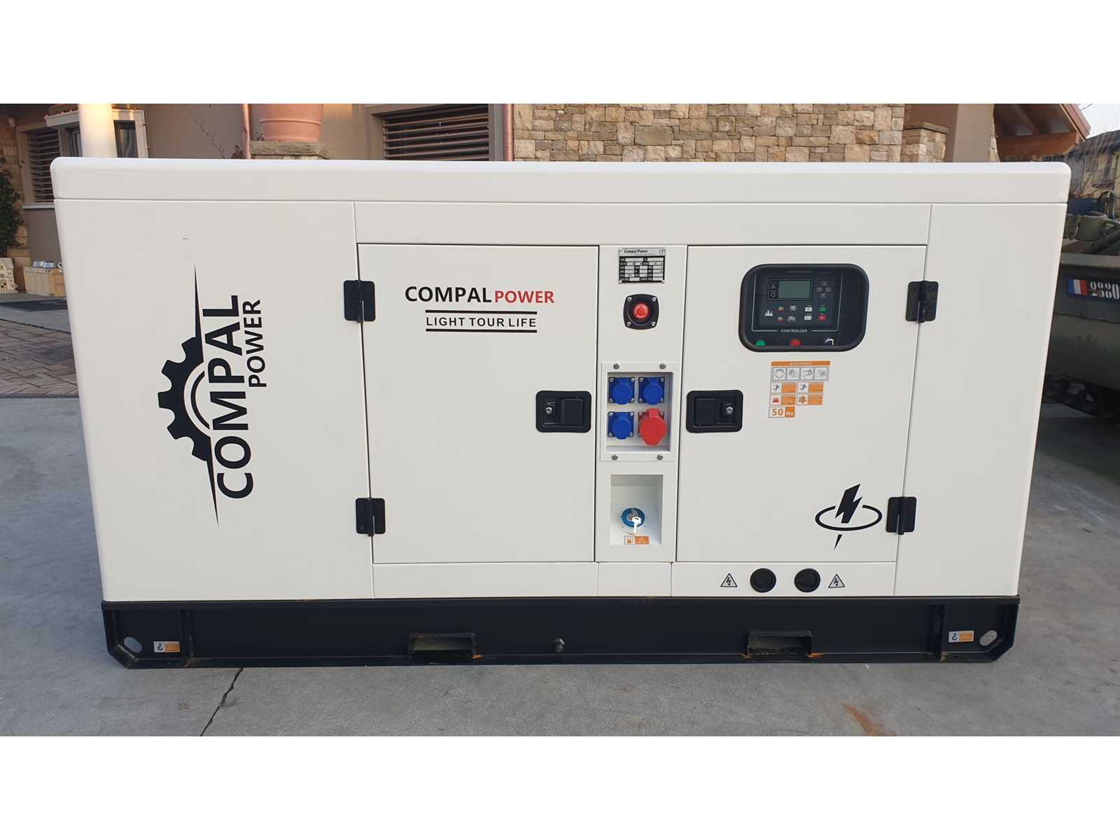 COMPAL POWER VG-R30 electric generator, super silenced, automatic electronic ignition, Ricardo 4-cylinder water-cooled engine, engine with fuel consumption reduction system. Outputs 220/380 Volt, power 30 kW-41, 3kVA Never used 0 hours. The power indicated refers to the peak power. Overall dimensions: 2000 x 1000 x 1200 mm Weight: 900 kg Auction-ID: A7-44802-174