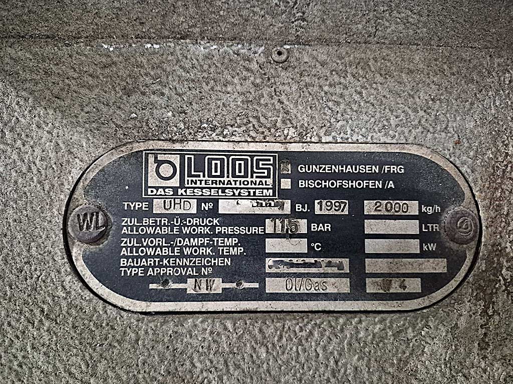 gebr. Kazan ------------------------------- - çerçevelere monte edilmiş - Üretici firma : LOOS, Gunzenhausen Tür: U-HD Isıtma yüzeyi yakl. : 14 m² Kapasite : 800 kg/saat Ab. Çalışma basıncı : 10,0 bar Artırılmış test basıncı : 18,0 bar KB'de su kapasitesi yaklaşık: 748 l Su içeriği dolu yakl. : 1.108 l Yapım yılı : 1996 Weishaupt kombi brülör GL3/1-E, ZMD, 90-630 kW, gaz kontrol bölümü, besleme suyu pompası, kontrol kabini ile donatılmıştır ve mevcut kaba ve ince bağlantı parçaları.