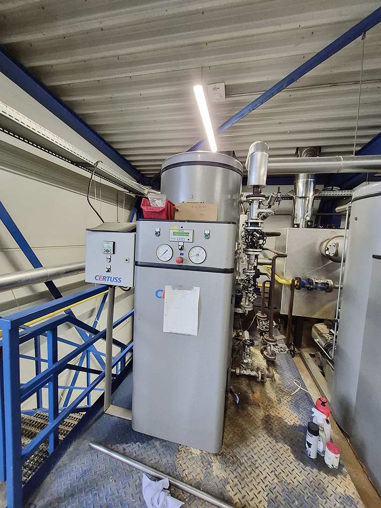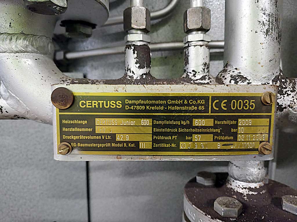 Üç adet aynı Certuss buhar jeneratörü mevcuttur. Üretim yılı: 2008/2009/2010, buhar çıkışı: 600kg/s, basınç kapı hacmi: 42.9l, sabit basınç: 10bar, test basıncı: 57bar. Makine boyutları X/Y/Z: 1650mm/900mm/2000mm, ağırlık: yaklaşık 950kg. Belgeler mevcut. Sahada inceleme yapılabilir.