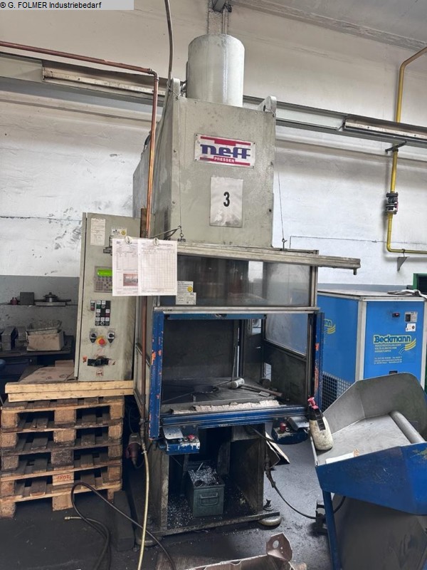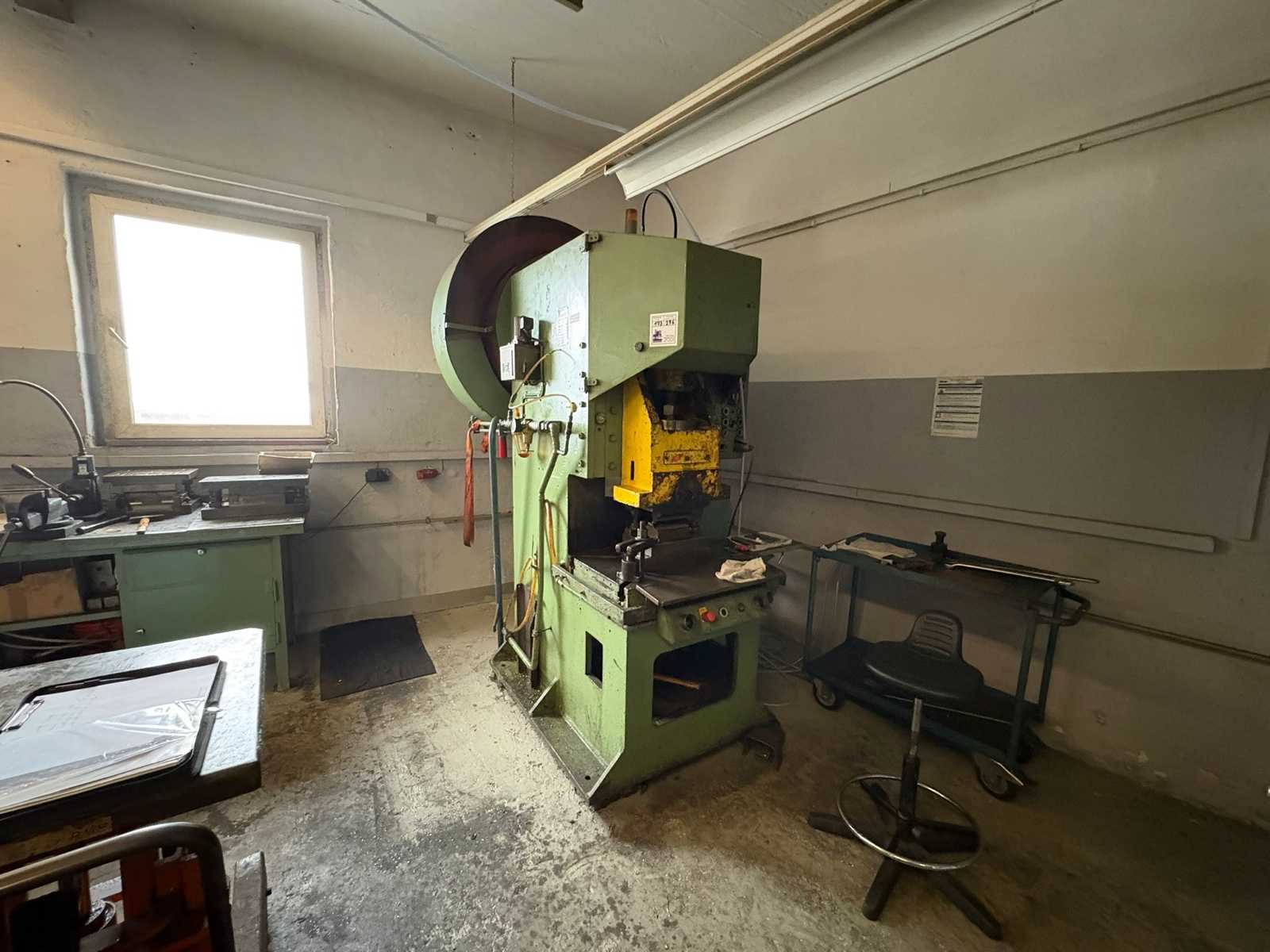 EBU 80 – Single-column eccentric press – Year of construction 1971 • Manufacturer: EBU Pressen • Machine type: Single-column eccentric press • Type: EBU 80 • Year of construction: 1971 • Machine number: 293 • Press force: 80 t (at 30° before subtitles) • Adjustable stroke: 12–60 mm • Plunger adjustment: 80 mm • Plunger stroke rate: 37–147 strokes/min • Weight: approx. 5,200 kg Dimensions (approx.) • Height: 2,500 mm • Width: 1,500 mm • Depth: 1,800 mm Equipment & Design • Mechanical eccentric press in heavy casting design • Large work table with T-slots • Adjustable stroke • Pneumatic unit with pressure regulator and pressure gauge • Side-mounted control cabinet with controls • Flywheel with protective cover • Tool holder on the ram Condition • Used machine • Signs of wear and tear due to age and use • Paint chipping and dirt ...