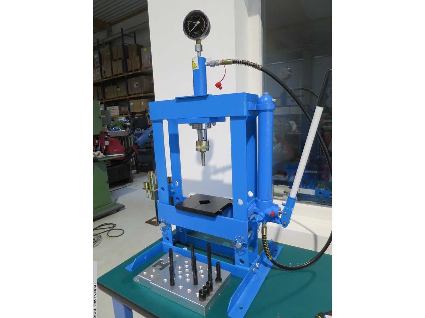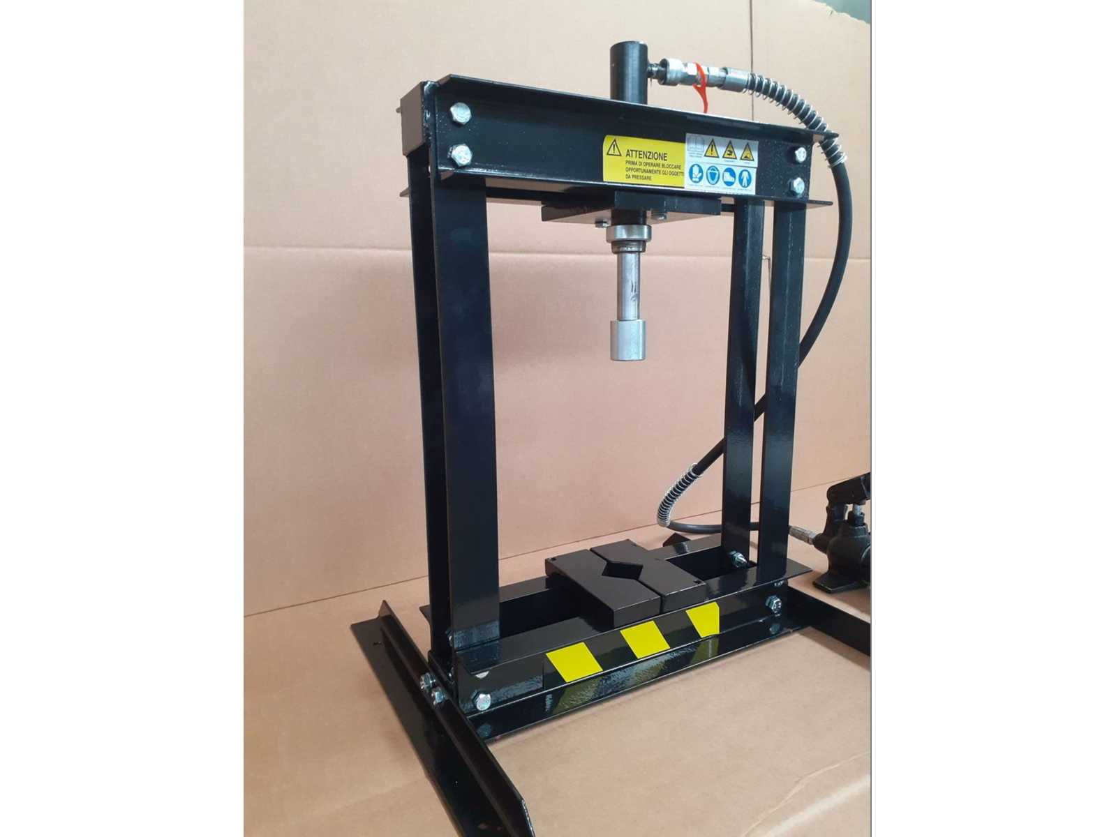 Frame press, CE certified according to the latest guidelines.>br>- with manual hydraulics>br>- cylinder to be moved sideways>br>- 2 pcs. press block 200x250x40mm / 200x70x40mm, max. 30t>br> with M16 threaded holes and some M16 threaded bolts>br>- 8 pcs. press bolts, 10 - 30mm,, with quick-change adapter, max. 20t>br>- 2 press pads>br>>br>pressure 20 t>br>stroke 180 mm>br>Clear width between uprights 540 x 100 mm>br>installation height max. 990 mm>br>cylinder diameter 72 mm>br>piston diameter 48 mm>br>Machine weight approx. 0.12 t>br>Space requirement approx. 0.8 x 0.7 x 1.8 m>br>>br> >br>Condition: never used / new (5) Auction-ID: A7-44817-166