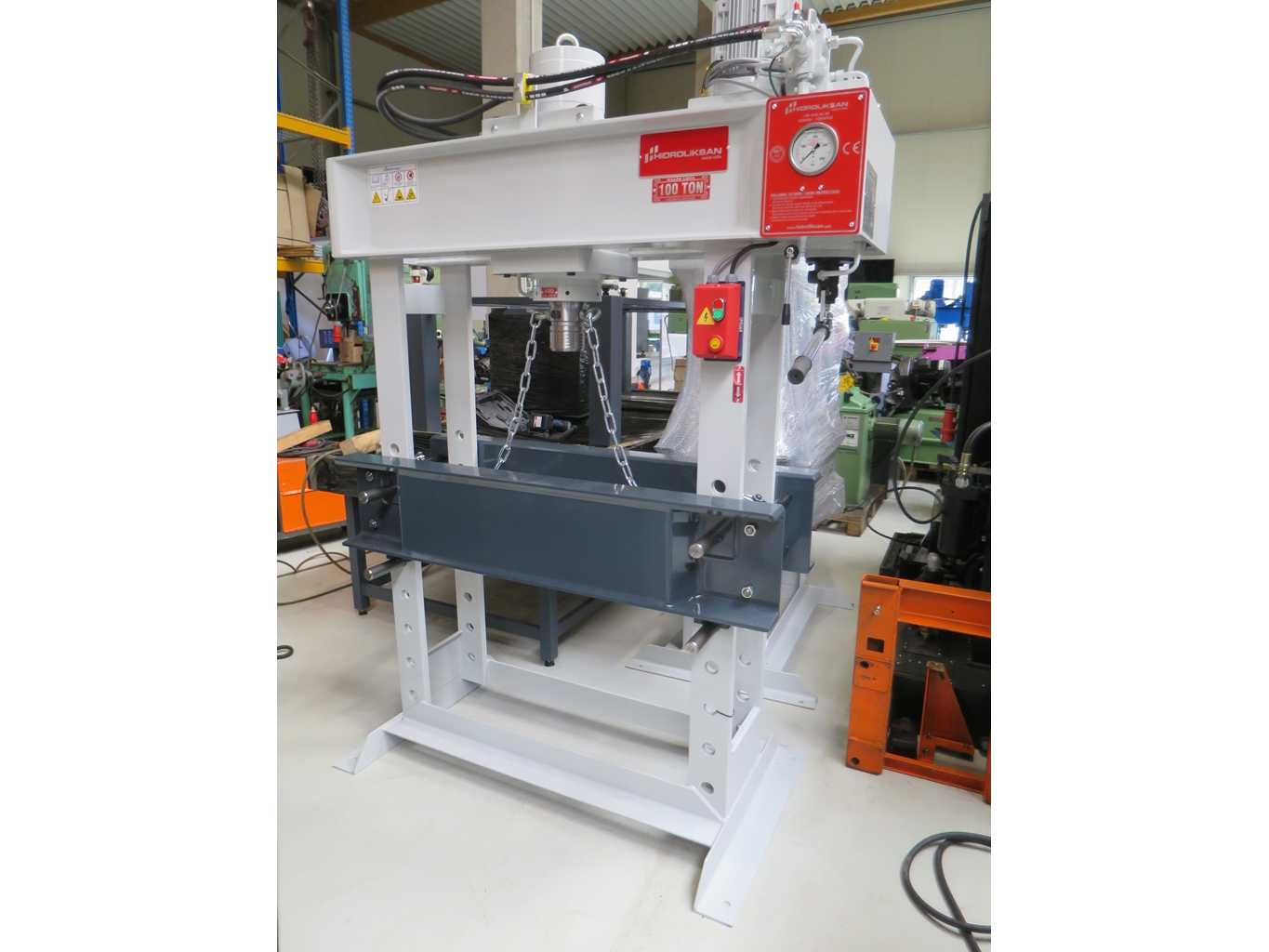 High-quality, hydraulic press can be operated both manually and motorized >br>.>br>cylinders can be moved sideways.>br>Safety valve for cylinder end position.>br>CE marking>br>pressure 100 t>br>stroke 400 mm>br>passage between the uprights longitudinally/sideways. 1010 x 300 mm>br>engine power 4.0 kW>br>litre capacity 11.0 l>br>installation height 900 mm>br>table surface 1010 x 560 mm>br>speed from 4.8 mm/sec>br>speed to 7.5 mm/sec>br>machine weight approx. 0.9 t>br>Dimensions L x W x H 1550 x 900 x 245 mm Auction-ID: A7-44817-145