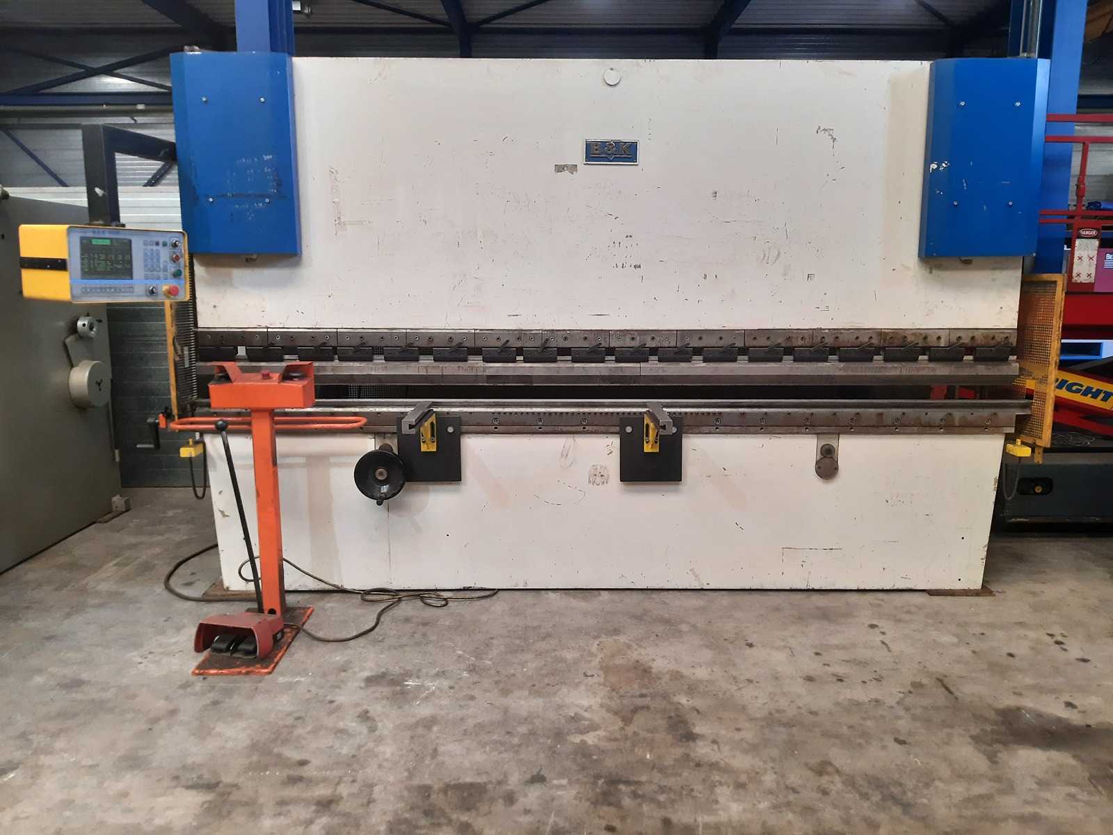 pressure: 200 tchamfer lenght: 3100 mmdistance between columns: 2550 mmstroke of upper beam: 200 mmthroat: 300 mmdayligth: 440 mmworking feed: 9.0 mm/secreturn speed: 80.0 mm/sec: 265 barControl: konv. work height max.: 965 mmtotal power requirement: 15.0 kWweight: 10500 kgrange L-W-H: 3360 x 1750 x 2800 mmEquipment:- simple / conventional electro-hydraulic press brake- pivoting operation, front left- electric, infinitely variable depth adjustment (Y1 Y2 axis) Torsion shaft for parallelism- Electro-motorized backgauge (X axis) with handwheel for fine adjustment on recirculating ball screws 2x manually adjustable stop fingers- manual (jog mode) and automatic cycle selector switch- manual table crowning- split set of roe foot upper tools ... H = 210 mm- 1x as good as new universal V-die block, reversible with anti-corrosion grease V openings in mm : 12/35/25 50 10/20/16/16 75 Dimensions of ...