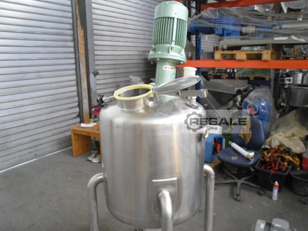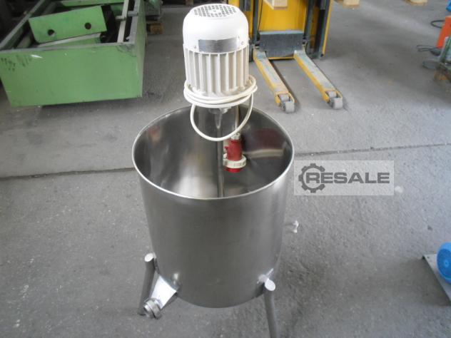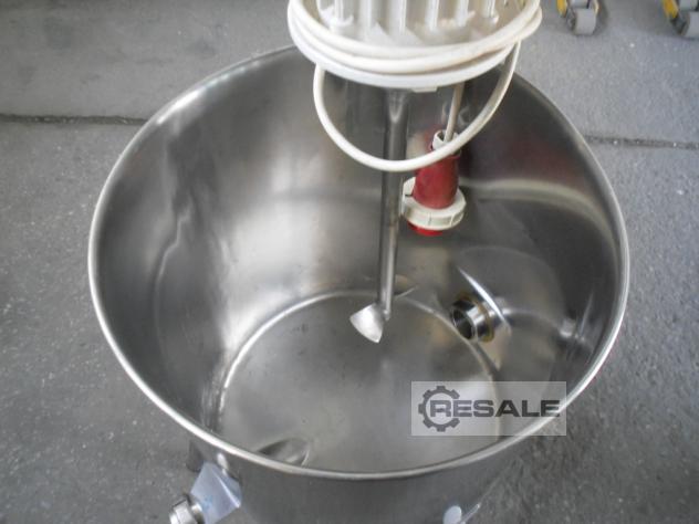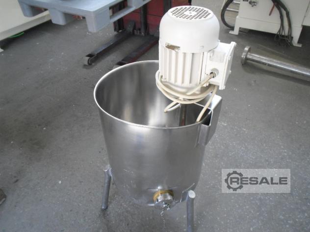 Karıştırma tankı 150 litre, karıştırıcı 0,6 KW, 900 rpm ve eğimli bıçaklı karıştırıcı 244 mm Konteyner: Tahliye musluğu ile 150 litre tek cidarlı paslanmaz çelik tank. Alüminyum profilli haddelenebilir alüminyum çerçeve 4545 mm. 2'si frenli olmak üzere 4 adet döner tekerlek. Elektrik motoru: Kullanılmış, güçlü elektrik motoru Baumüller, 0,6 kW, 900 rpm, 3 x 230/400 volt. Motor koruma fişi ile. Mil: Hassas paslanmaz çelik şaft D20, uzunluk 700 mm, çap 20 mm, Malzeme: Paslanmaz çelik 1.4301. Kaplin: Sert şaft kaplini, malzeme paslanmaz çelik 1.4571 Karıştırıcı: Çift kanatlı eğimli bıçaklı karıştırıcı, çap 244 mm, malzeme paslanmaz çelik 1.4581, bıçak açısı ayarlanabilir.