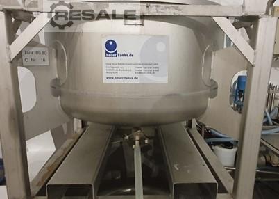 Paslanmaz çelik IBC konteyner, dökme yük konteyneri, kapasite 750 litre İçerik: 750 Ltr. Çalışma basıncı: basınçsız Yapım yılı: unbek. Üretici: unbek. Malzeme: Paslanmaz çelik 1.4301 Tasarım: Dikdörtgen konteynerler, istiflenebilir, forkliftler ve transpaletler gibi tüm yaygın endüstriyel kamyonlarla geçirilebilir, Paslanmaz çelikten süngü kapaklı kubbe kapağı 400 mm, Edelstah,l'de DN 250 (250 mm) tahliye diski valfi el kollu, üst katta 1 inç dişli bağlantı son kullanım: gıda Yükseklik: yaklaşık 1.450 mm Genişlik/derinlik: yaklaşık 1.180 mm / yaklaşık 980 mm