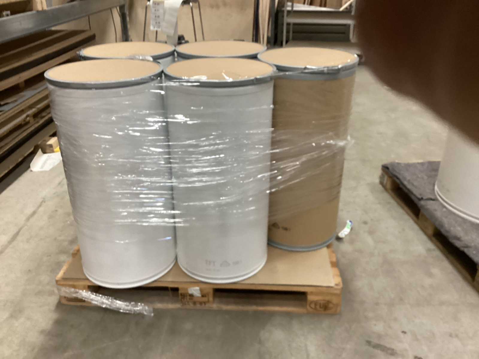 5 bulk containers, made of white and brown cardboard, lid made of wood-based material, metal locking ring with snap closure, 40 cm diameter and 80 cm high, content: 100 litres, pallet in exchange Auction-ID: A1-44710-92
