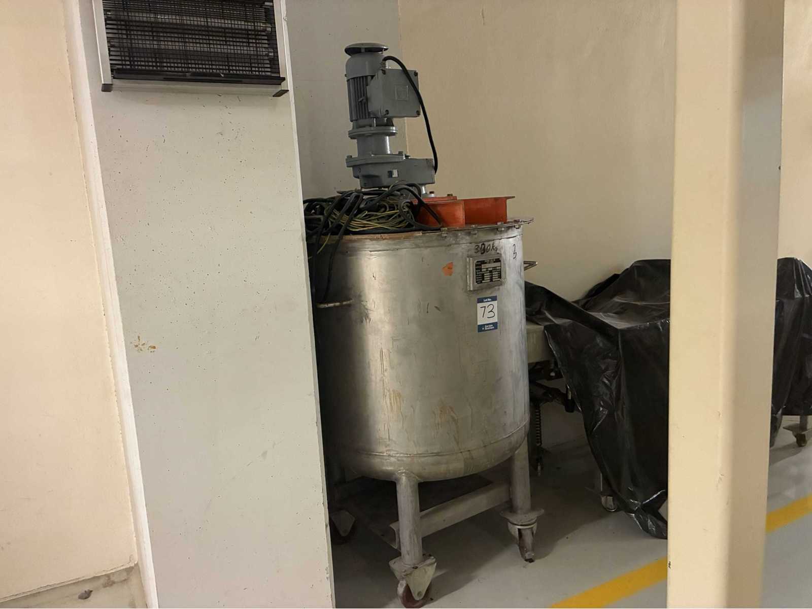 Mobile stainless steel mixing vessel with top mounted agitator, bottom discharge, max capacity 700L, year 1988, S/N 551. Auction-ID: A1-45187-73
