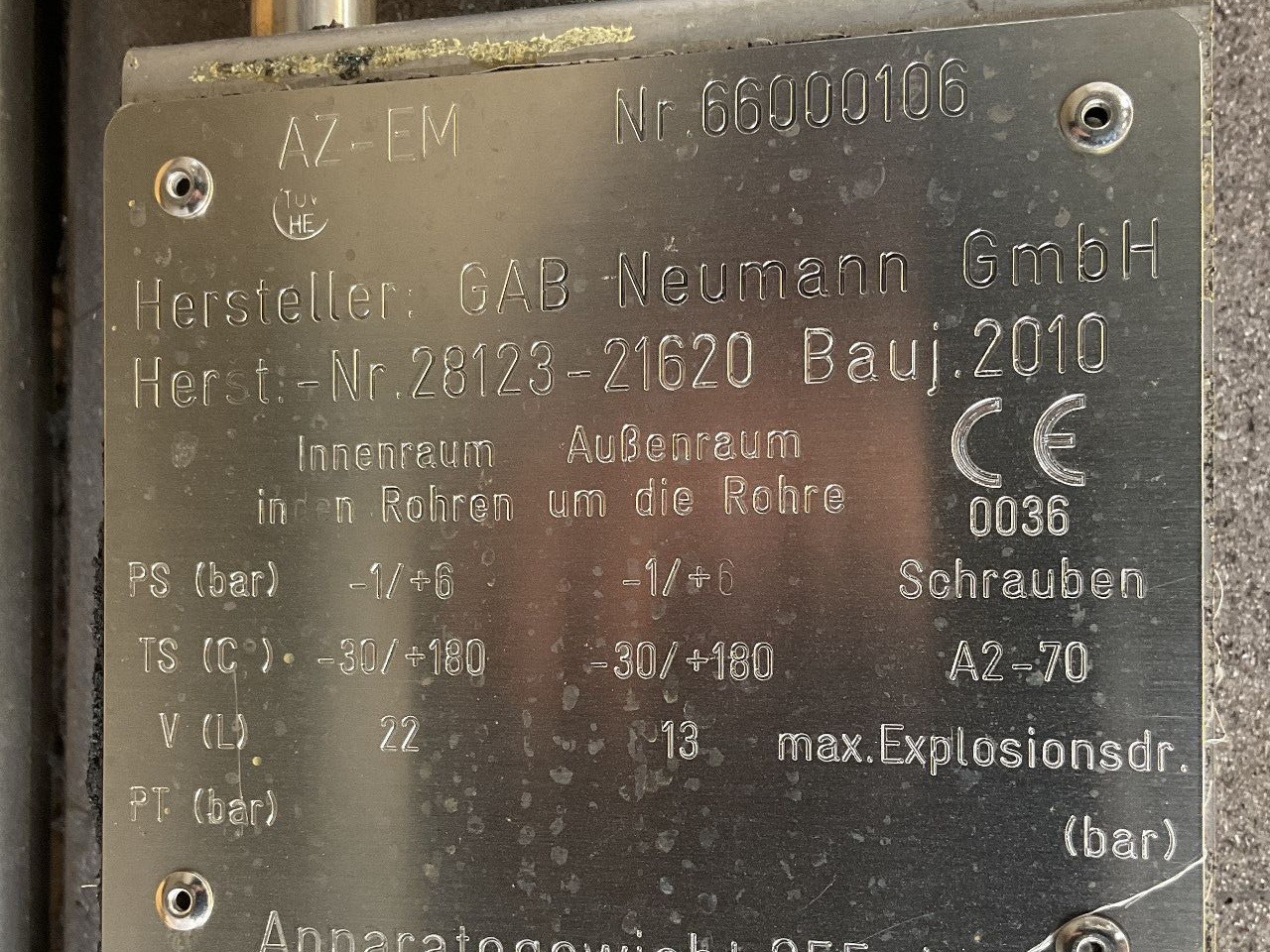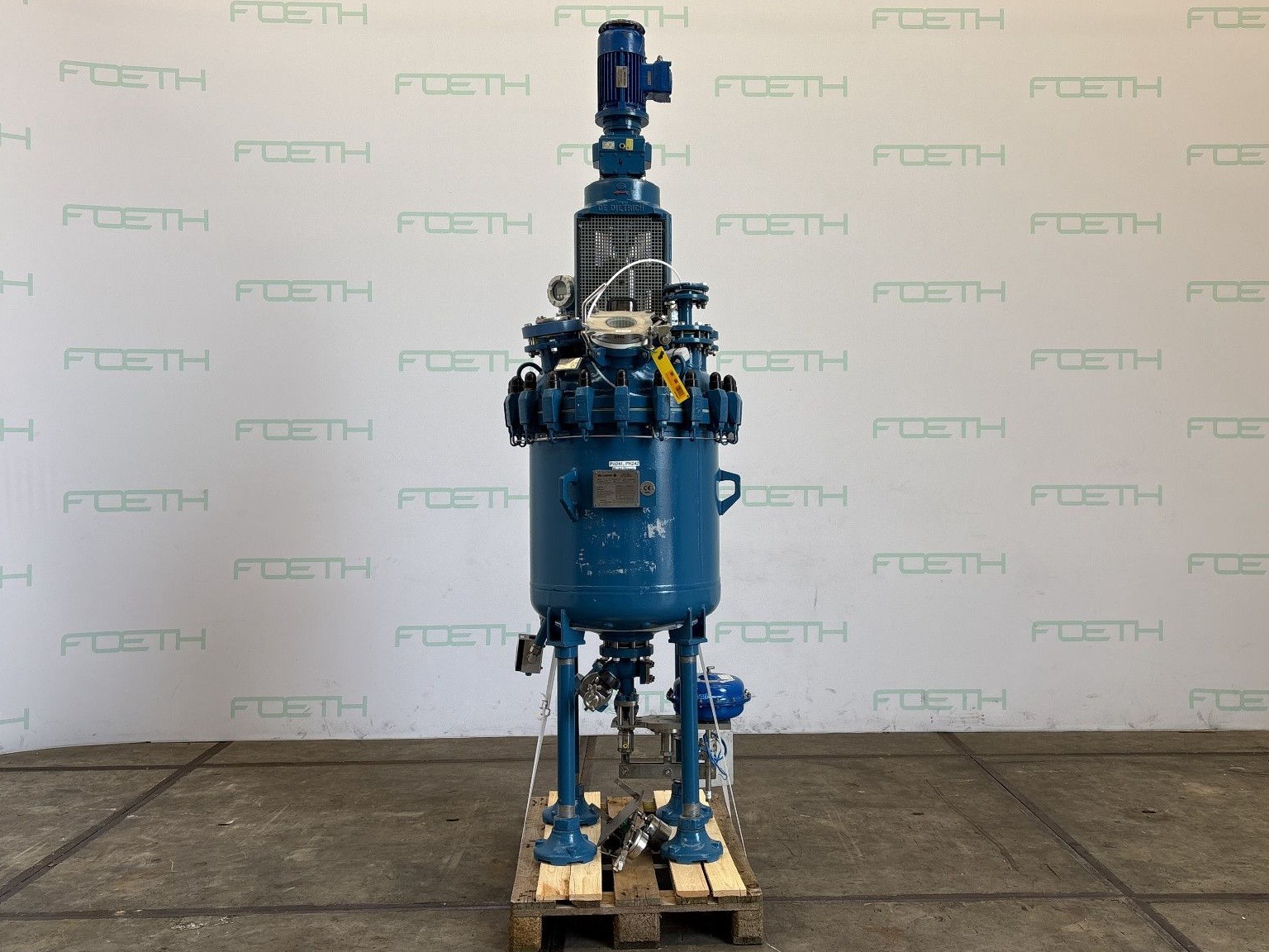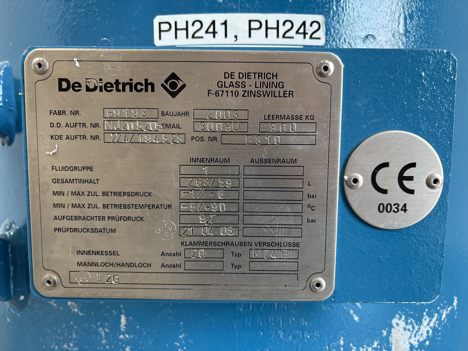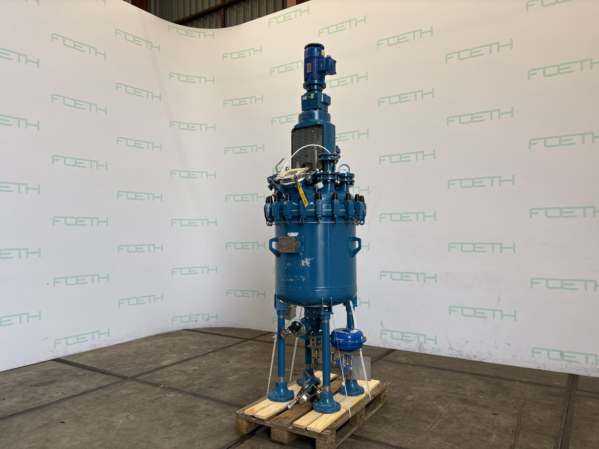 General SKU327X681 LocationBarneveld CEcheck MakeDe Dietrich TypeAE 250 Pressure Working pressure7 Bar Vacuum possiblecheck Main Features MaterialGlass Volume327 Ltr. Motor1.5 KW Vacuumcheck Specified Features - Stirring vessel MaterialGlass - Enamel (3009U) Closed stirring vesselcheck Capacity250 l. (327 l.) Vessel sizesø 700 x 900 mm Dished bottomcheck With covercheck Top connectionscheck OutletDN100 with pneumatic valve Max. temperature—5 / 90 °C With propellor stirrercheck Motor1,5 kW (400 V, 1390 rpm, (Ex)) Speed mixing shaft168 rpm Information No.69193 Year of construction2008 Mounted on legscheck Floorspace0,95 x 0,95 m Total height3,00 m Weight900 kg Extra SpecificationsThe vessel is designed per Directive 94/9/EC (ATEX), Category II 2 G, Zone 1, Gas Group IIB, T-class T4 (max. 135 °C), max. medium temp. 90 °C. Conformity per Directive 97/ ...