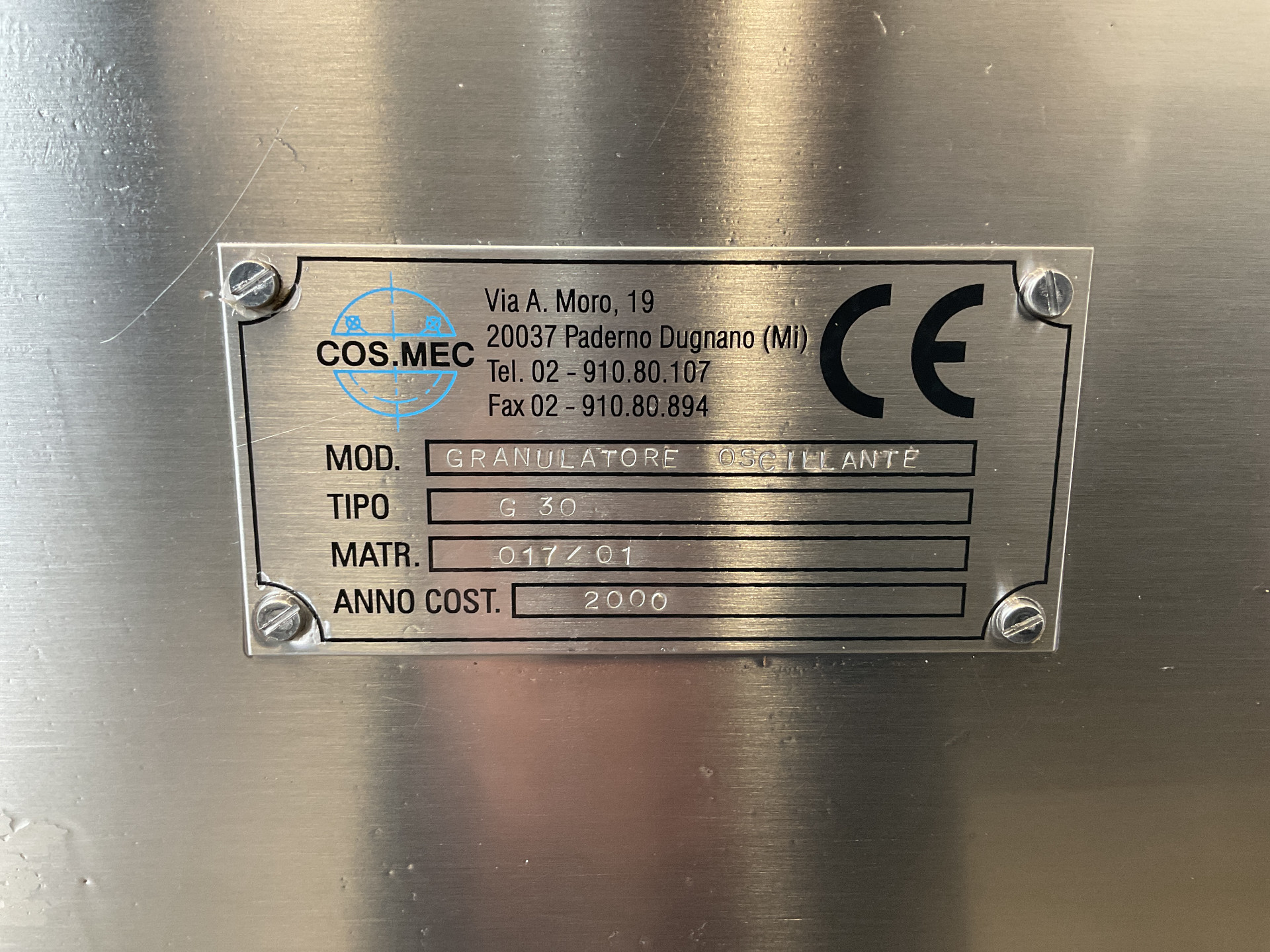 General SKU255X232 MakeCos.mec LocationBarneveld CEcheck TypeG30 Main Features MaterialStainless steel Motor1.1 KW Width100 mm Specified Features - Sieve granulator Granulating sievecheck oscillating Rotor sizesDia. 100x330 mm Sieve sizesDia. 110x330 mm Sieve perforation0,5x0,5 mm InletDia. 200 mm, with pneumatic valve OutletDia. 200 mm, with pneumatic valve Motor1,10 kW (400 V, 1400 rpm) With variable speed drivecheck Speed324,6 rpm MaterialStainless steel 1.4306 (304L) Information No.017/01 Year of construction2000 Mounted on stainl. st. framecheck Mounted on wheelscheck With switchcheck Floor space1,10x0,95 m Total height1,90 m Weight380 kgNew arrivalsSieve granulatorsCosmecNew arrivalsSieves > Sieve granulatorsBrand > Cosmec What you can expect from Foeth: -- Machine is in working condition -- At a reduced price compared to new -- Ready for shipping to a ...