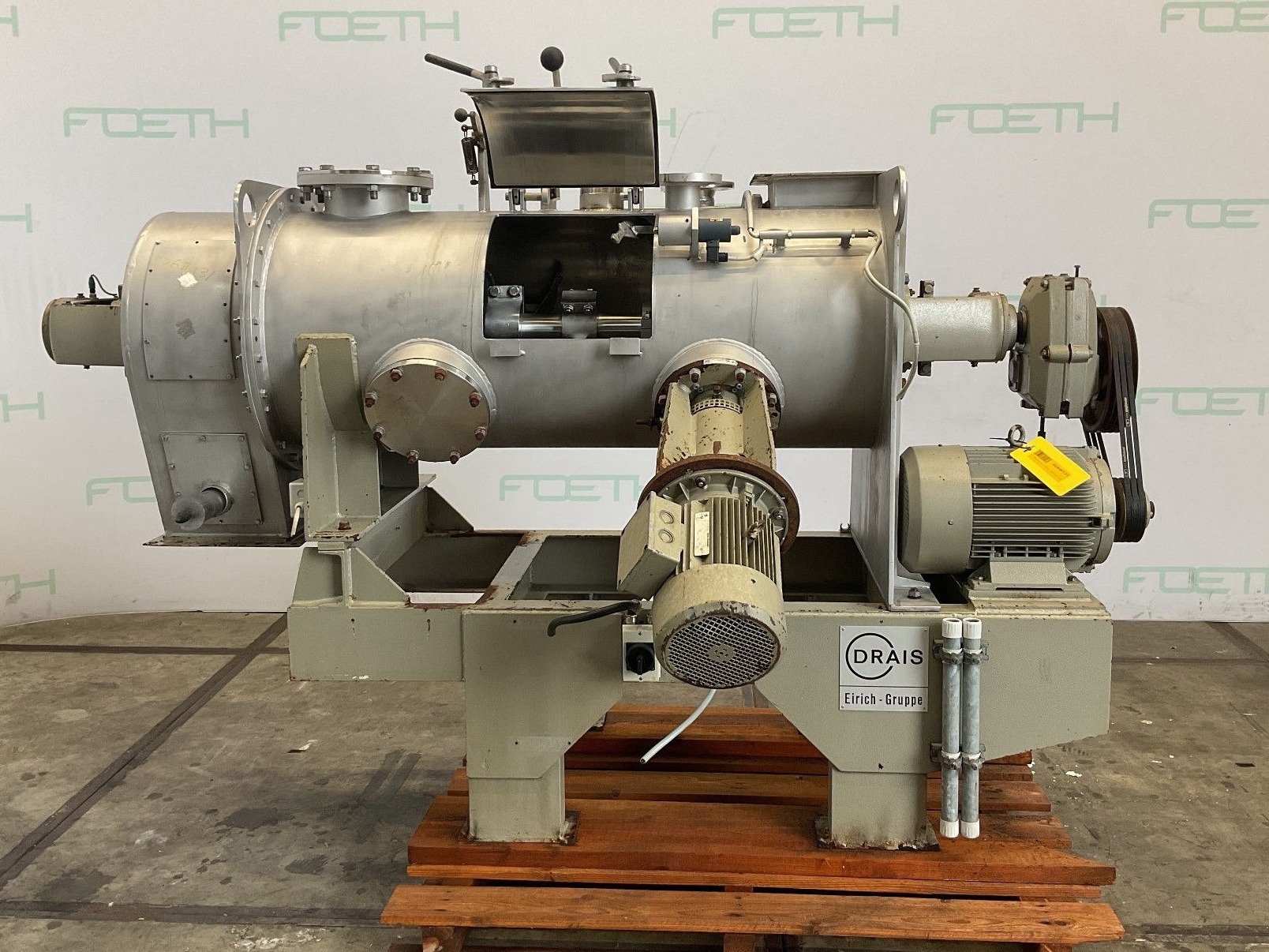 General SKU026W131 MakeDrais TypeKT-400 Year of construction1991 Mounted on framecheck Main Features MaterialStainless steel Volume400 Ltr. Motor18.5 KW Specified Features - Powder turbo mixer Powder turbo mixercheck Continuous mixercheck Capacity400 l. Trough sizesø 600 x 1450 mm Inlet250 x 300 mm Top connectionscheck 4x Inspection hatch400 x 370 mm Outlet290 x 250 mm With adjustable packing glandscheck Motor11,0 kW (380 V, 1450 rpm) Speed mixing shaft100 rpm With lump breakercheck Motor7,5 kW (380 V, 2780 rpm) Speed lumpbreaker2870 rpm MaterialStainless steel Information LocationBarneveld Floorspace2,8 x 1,5 m Total height1,7 m Weight1640 kgCatalysts & fillersFeed additivesDiscountOther pharmaceuticsCosmeticsFood additivesSugarAnimal feedOther feedConfectionerySolid pharmaceuticsDyes & pigmentsMinerals & inorganicSpicesPowder turbo mixersOther chemicalSt ...
