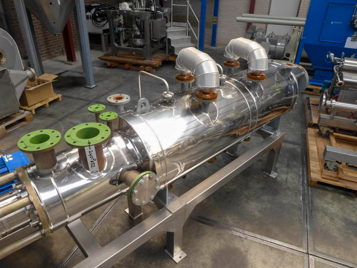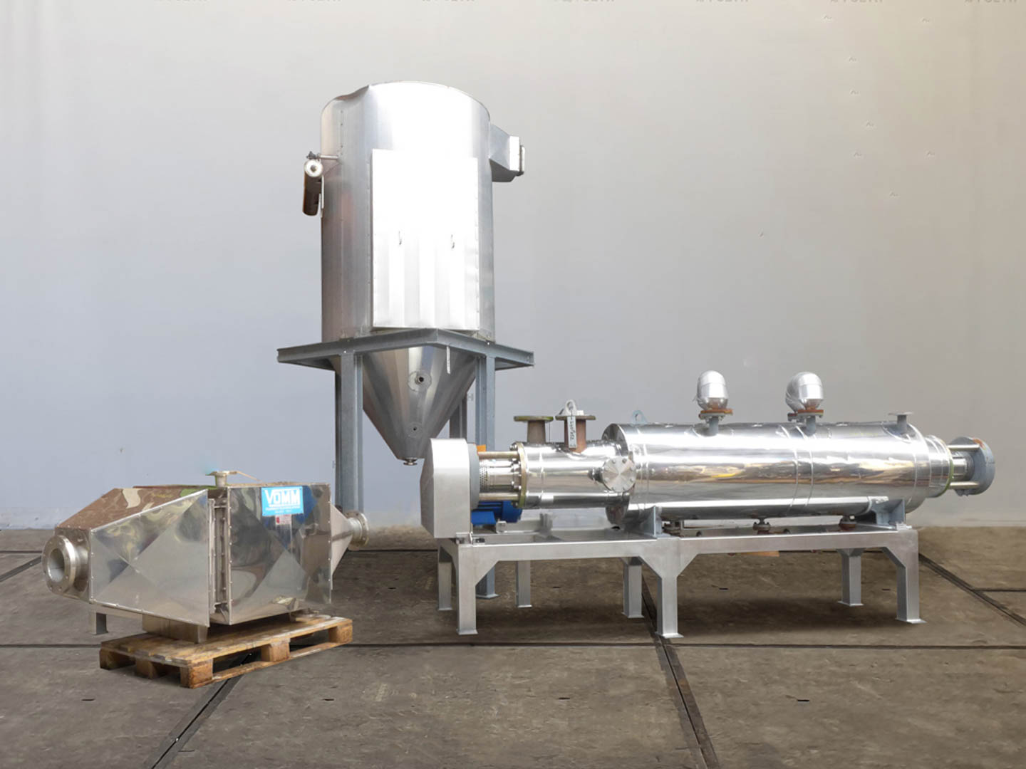 General SKU240P252 MakeVOMM TypeTurbodryer ES - 350 Year of construction1998 Mounted on framecheck Main Features MaterialStainless steel Volume1000 Ltr. Motor18.5 KW Specified Features - Paddle dryer Paddle dryercheck Turbo Continuouscheck Capacity±1000 Ltr. Trough sizesdia.350mm x2990mm Inletdia.125mm, (2x)dia.100mm, (2x)dia.25mm Outlet250x120mm With jacketcheck With mechanical sealcheck Motor18.5 KW, 380/660 Volt (EEx-d) MaterialStainless steel 1.4306 (304L) Information LocationBarneveld Weight1850+2500+520+800+570 kg total: 6240 kg ATEX compatiblecheck Extra Specificationsincluding: -Fan type r2352y2. :volume 1500m3/hr, Motor 11 kW 380/660 Volt (EEx-d), -Faco heatexchanger type Risc. -Faco condensor, -Filter with total filter area 14.56m². -mechanicalseal sparesets Catalysts & fillersFeed additivesOther pharmaceuticsCosmeticsSugarAnimal feedOther feedConf ...