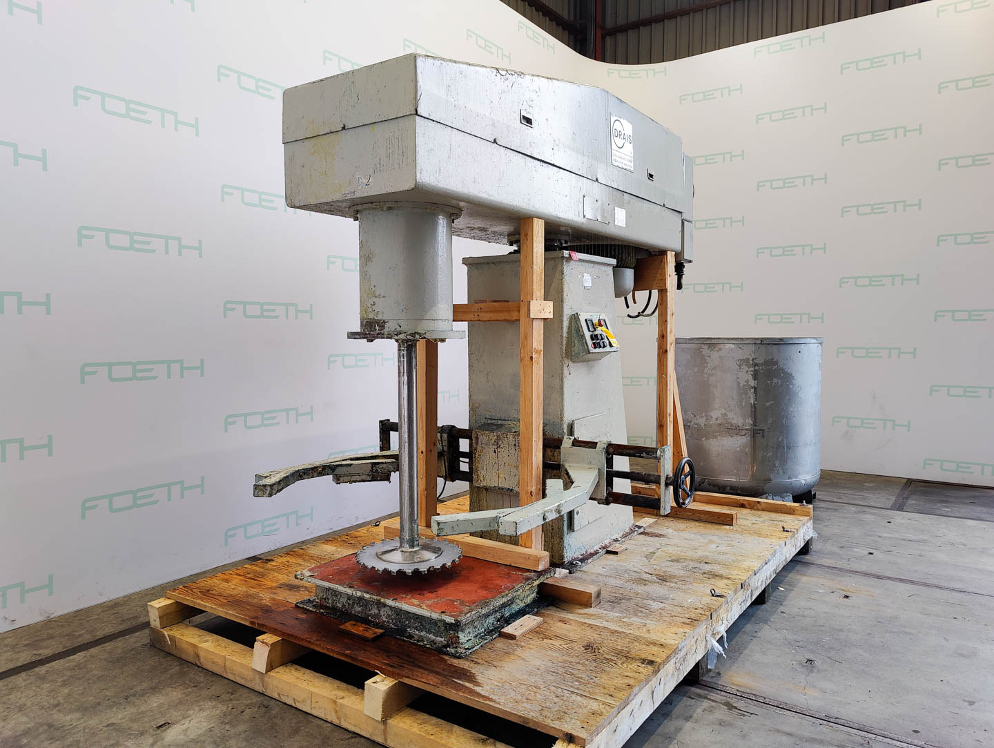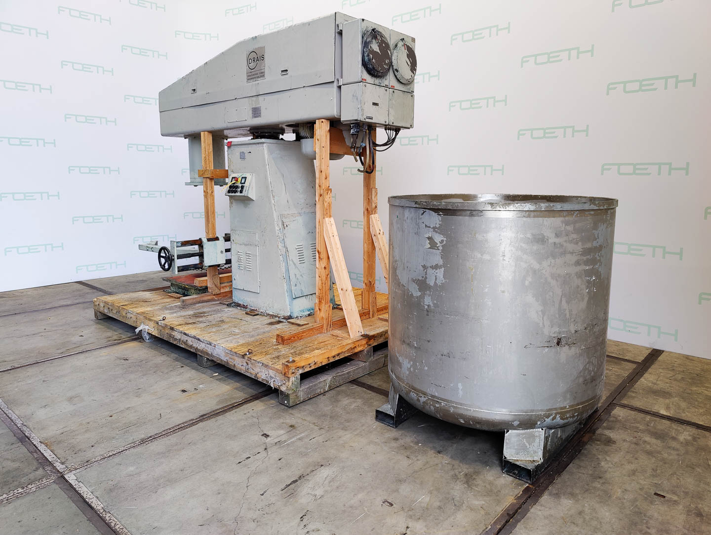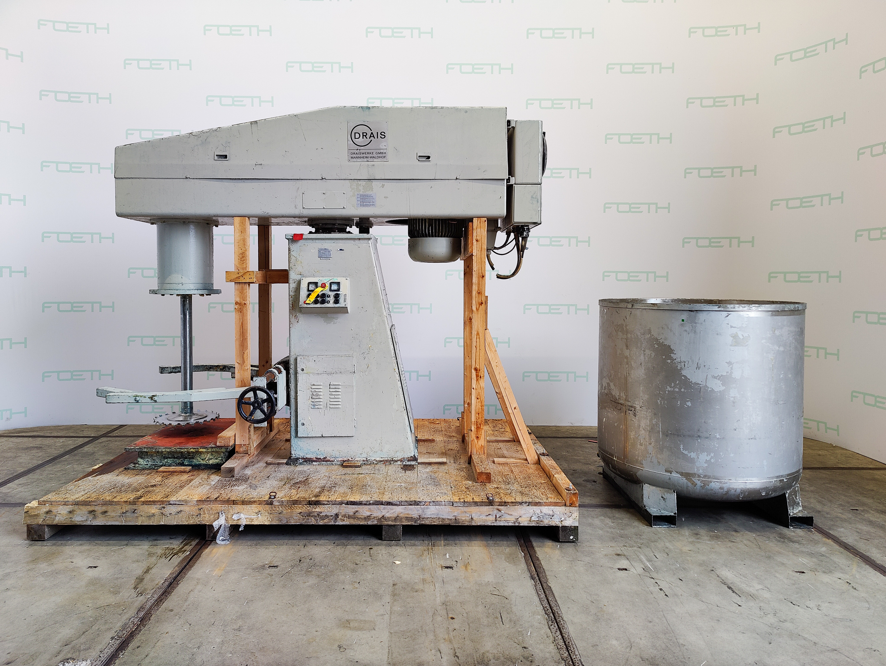 General SKU355W950 MakeDraiswerke LocationBarneveld TypeRN 3-36 Main Features MaterialStainless steel Volume2500 Ltr. Motor36 KW Specified Features - Dissolver MaterialChromed steel, Stainless steel 1.4301 (304), Stainless steel 1.4571 (316Ti) Dissolvercheck Shaft length1000 mm Disc diameter500 mm Between shaft and frame730 mm Hydraulic drive150 bar Motor36 kW, (380 V, 1425 rpm (Ex)) With pans1 Capacity2155 l Pan sizesdia. 1400x1400 mm OutletDia. 45 mm With hydraulic liftingcheck Motor1kW, 230/400V, 1415 rpm (EX) Information No.51765 Year of construction1984 With switchcheck Floorspace2,0 x 3,40 m Total height2,70 m Weight3900 kg ATEX compatiblecheck Extra Specificationsdisk material: chrome. shaft material: stainless steel 316TI vessel material: stainless steel 304 Catalysts & fillersSolventsDetergent & surf.Other pharmaceuticsLubricants & oleoOther feedD ...