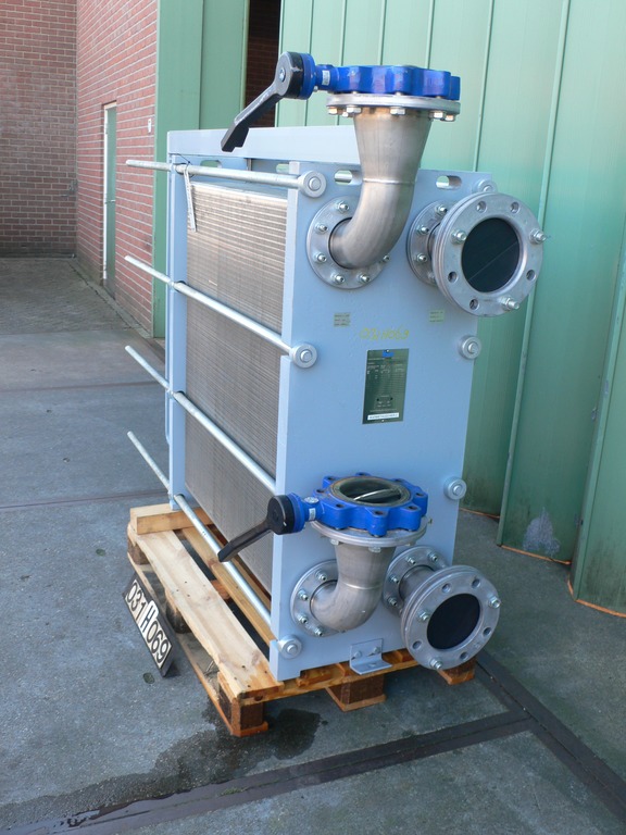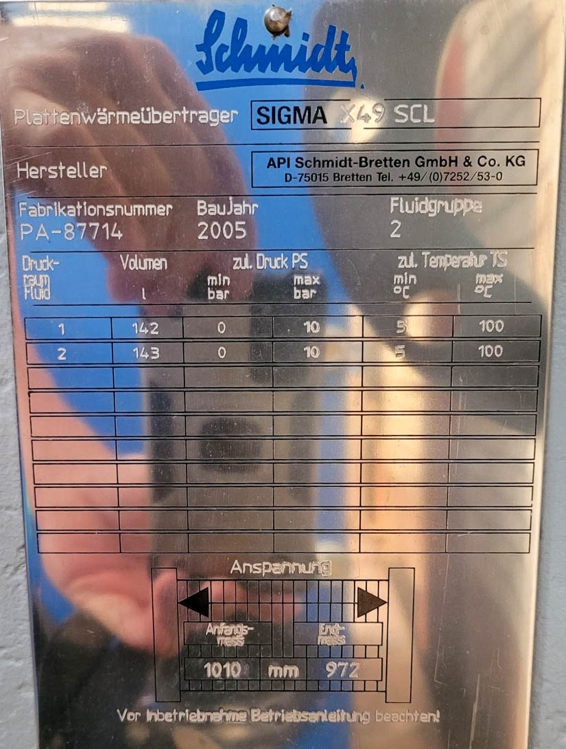 General SKU031H069 MakeAPI Schmidt-Bretten TypeSigma X49 SCL No.PA-087714 Year of construction2005 LocationBarneveld Pressure Working pressure10 Bar Main Features MaterialStainless steel Surface146.8 m2 Size length1100 mm Sizes width400 mm Specified Features - Plate heat exchanger MaterialStainless steel 1.4301 (304) Plate heat exchangers(1x) Heating surface146,8 m2 Capacity142/143 Ltr Number of platens360 Plate sizes± 1100x400mm Connections4x dia. 100mm Max. temperature100 Degr. C. Capacity900 KW Information Floorspace2,5x0,8 M Total height1,6 M Weight1500 KG Extra Specificationssealing material NBR Technical specs Extra informationindicated size is platen size, capacity is 900 KWDiscountPlate heat exchangersApi SchmidtDiscountHeat exchangers > Plate heat exchangersBrand > Api Schmidt What you can expect from Foeth: -- Machine is in working condition -- A ...