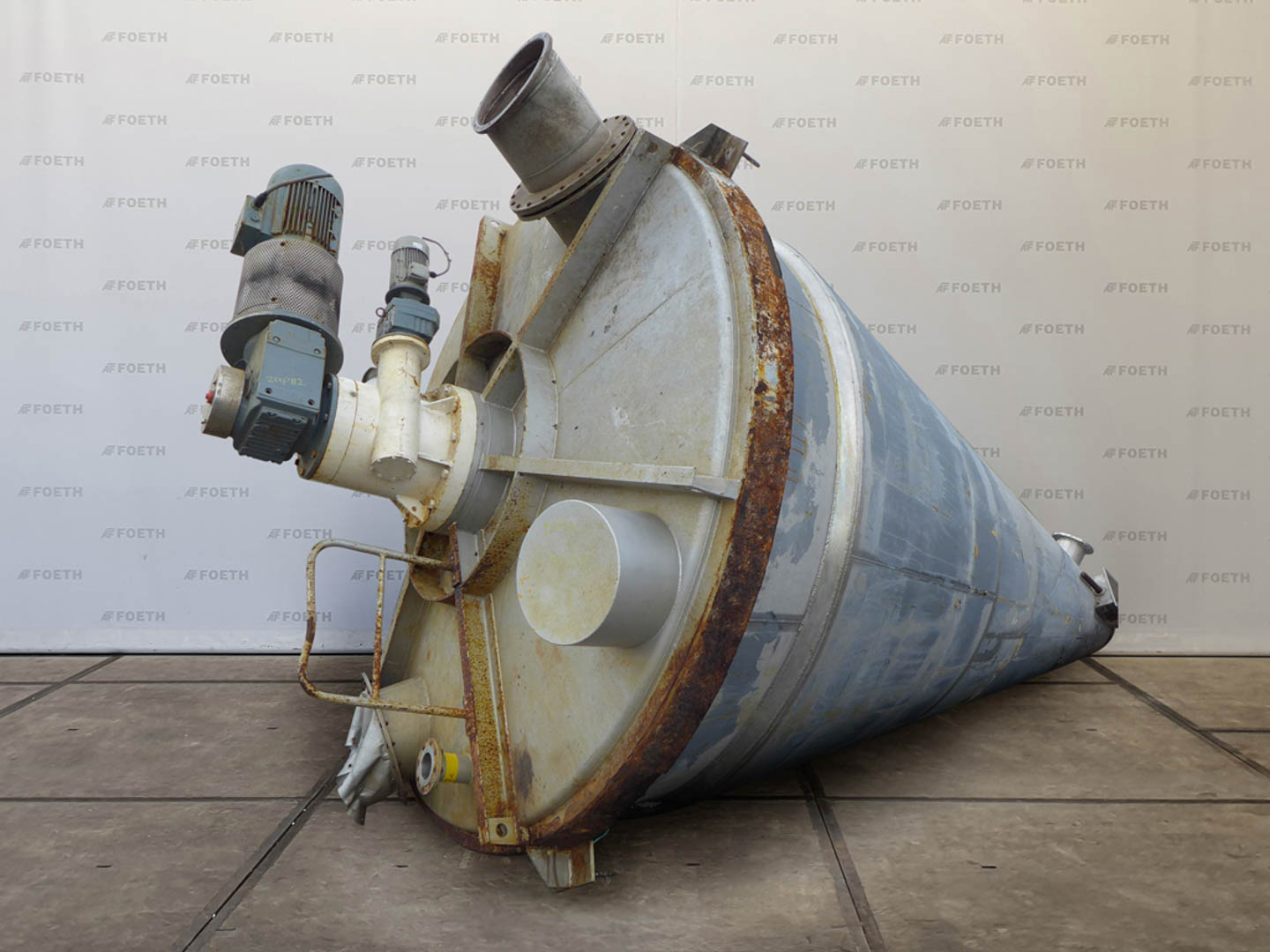 General SKU201P112 MakeBOLZ GmbH No.M 1107 T 4402 Year of construction1988 LocationBarneveld Pressure Working pressure jacket3 Bar Main Features MaterialStainless steel Volume11800 Ltr. Motor15 KW Specified Features - Conical mixer Conical mixercheck Capacity11800 l (gross) Largest cone diameter2900 mm Cone height4900 mm Dished topcheck Manholeø 600mm With stainless steel armcheck Top drivecheck Motorscrew +/- 15 kW (400 V) 65 rpm Motorarm 1,5 kW (400 V) 35 rpm Cantilevered screwcheck With jacket1200 l (20m2) Max. temperature100°C MaterialStainless steel 1.4552 Information Floor space3,2 x 3,2 m Total height6,5 m Weight±7000 kg Extra Specifications- used as a cooler. Feed additivesPaper & otherOther pharmaceuticsCosmeticsOrganicsSugarAnimal feedOther feedConfectionerySolid pharmaceuticsDyes & pigmentsPlastic & rubberMinerals & inorganicPlastic & polymer ...