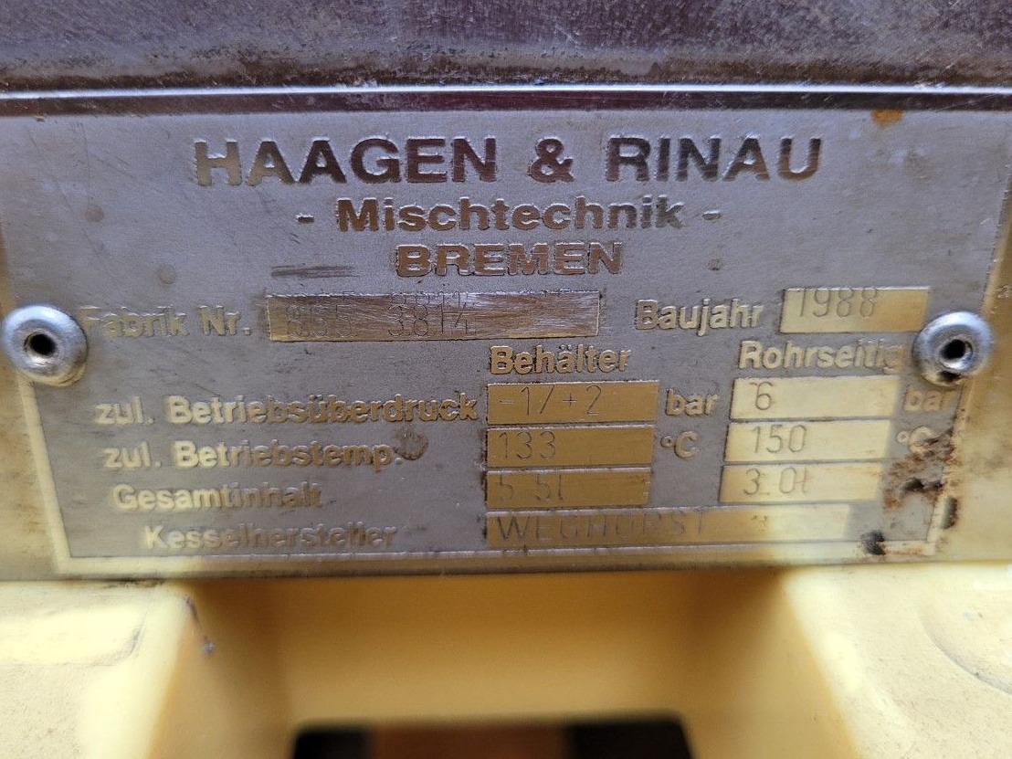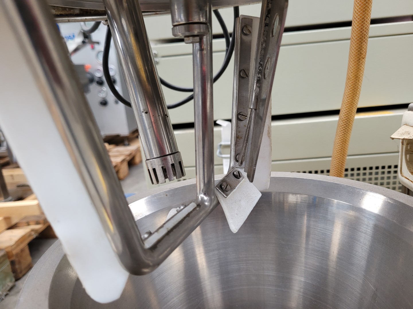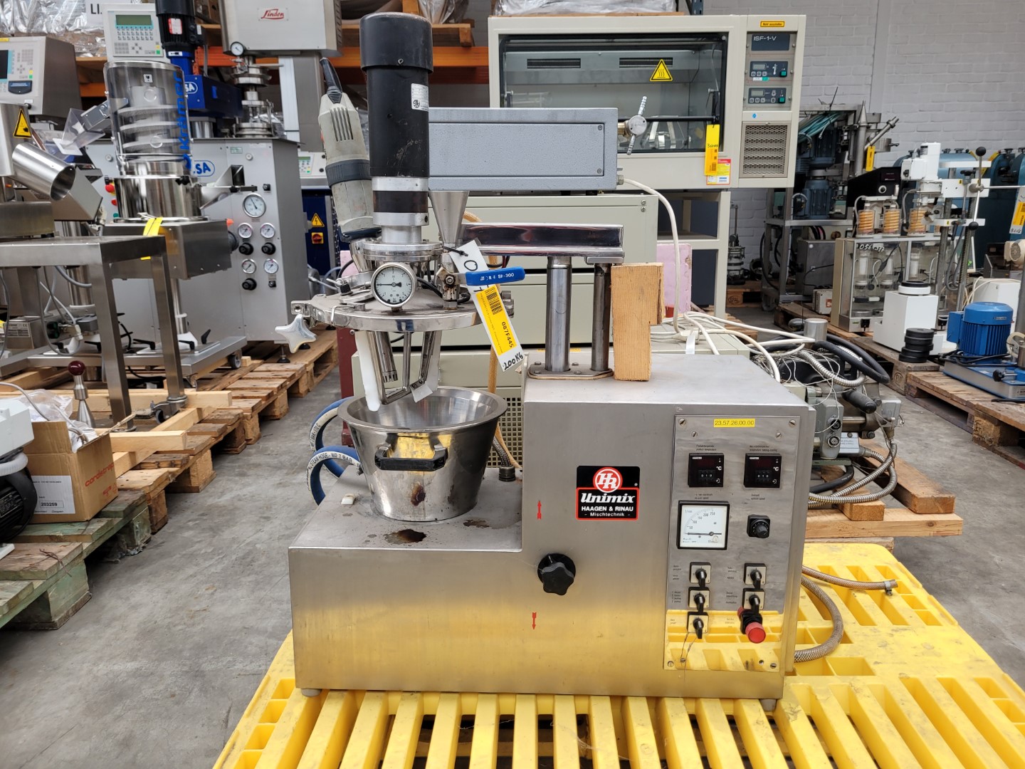 General SKU087F445 MakeUnimix Haagen & Rinau Bremen No.865 3814 Year of construction1988 LocationBarneveld Pressure Working pressure2 Bar Vacuum possiblecheck Working pressure jacket6 Bar Main Features MaterialStainless steel Volume5.5 Ltr. Specified Features - Processing vessel MaterialStainless steel Closed stirring vessel(1x) Capacity5,5 Ltr Vessel sizesdia. 245x165mm (conical vessel) With covercheck With jacket(3 Ltr), With electric heating Max. temperature133/150 Degr. C. (vessel/jacket) With anchor stirrerscraper stirrer (motor 370 Watt) With homogenisercheck Motor900 Watt, 220 Volt (1 Ph) Information With switchcheck Floorspace0,8x0,5 M Total height1,0 M Weight200 KG Technical specs Extra informationconical vesselDiscountProcessing vesselsUnimix H&RDiscountProcessing vessels > Processing vesselsBrand > Unimix H&R What you can expect from Foeth: -- Ma ...