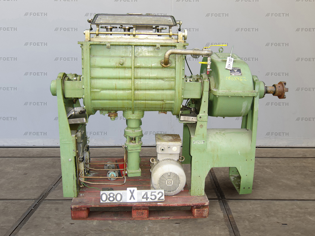 General SKU088X452 MakeWerner & Pfleiderer TypeUK-14-X (fixed trough) No.89802 Year of constructionunknown LocationBarneveld Main Features MaterialMild steel/Stainless steel Volume200 Ltr. Motor5.5 KW Specified Features - Z-blade mixer MaterialMild steel, Stainless steel Z-blade mixer(1x) Capacity200 Ltr (useful) Trough sizes745x690x570mm With covercheck With jacketcheck Single gearedcheck With adjustable packing glandscheck Motor5,5 KW, 380 Volt (Ex) Bottom outletdia. 75mm (2x) Information Floorspacewithout motor 2,2x1,0 M Total height1,6 M ATEX compatiblecheckCatalysts & fillersFeed additivesPaper & otherDiscountZ-blade mixersDetergent & surf.Other pharmaceuticsCosmeticsSugarLubricants & oleoAnimal feedOther feedSolid pharmaceuticsDyes & pigmentsMinerals & inorganicPlastic & polymersRubberOther chemicalStarchPowdered foodsPaints & coatingsOils & fatWerner & Pf ...
