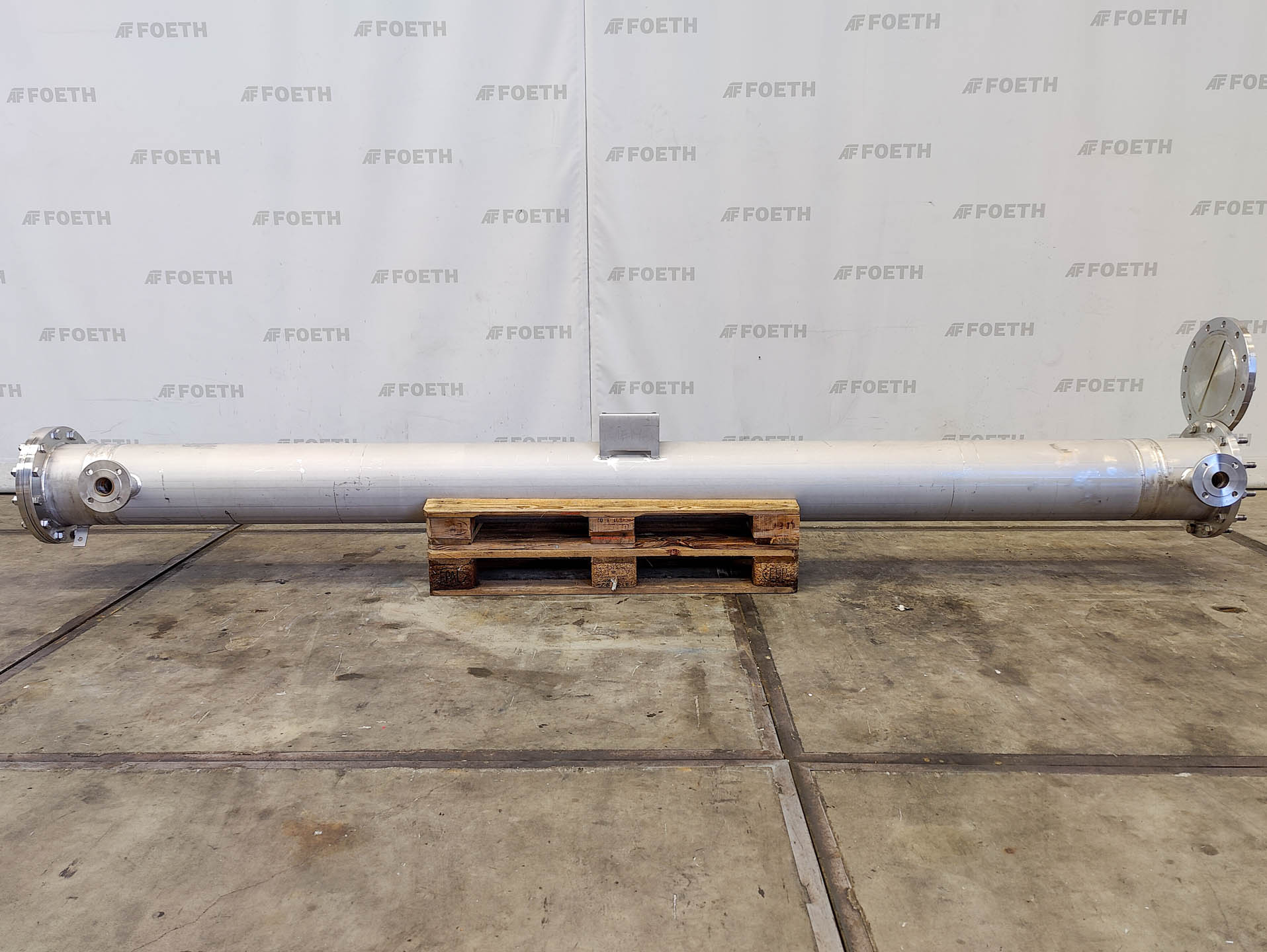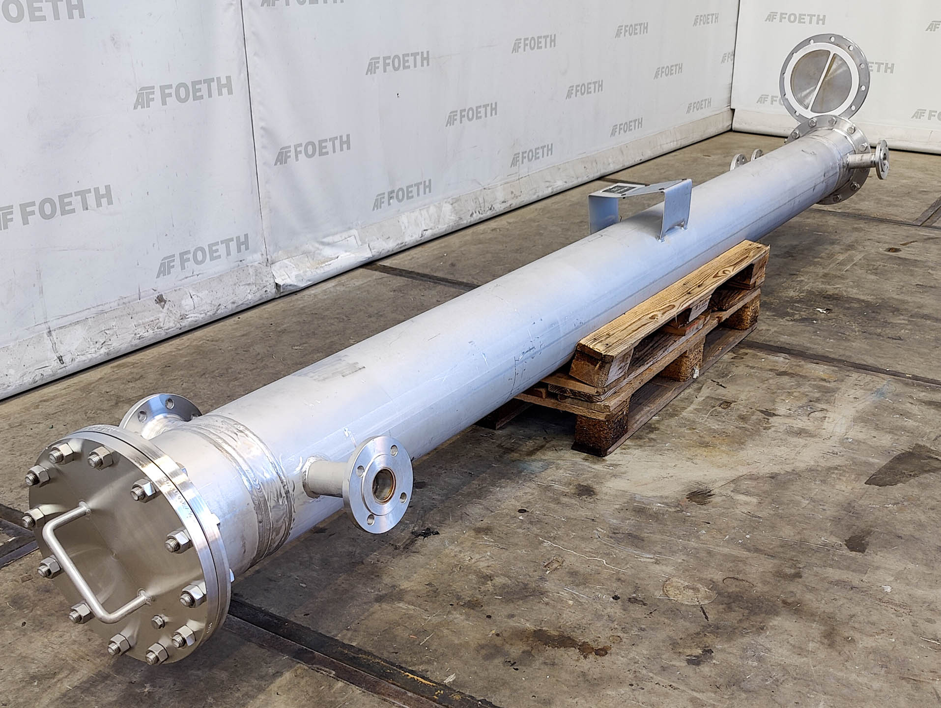General SKU212T543 MakeKuehni LocationBarneveld Pressure Vacuum possiblecheck Vacuum possible jacketcheck Working pressure shell1 Bar Vacuum possible shellcheck Working pressure tubes6 Bar Main Features Shell (Material)Stainless steel Tube (Material)Stainless steel Surface6.3 m2 Specified Features - Shell and tube heat exchanger MaterialStainless steel 1.4571 (316Ti) Heat exchangercheck Horizontalcheck Heating surface6.3 m² Tube capacity17,5 Ltr. Number of tubes:1 Tube diameter30 mm Tube length± 13,1 m Wall thickness tubes2 mm Shell capacity41 Ltr. Shell diameter190 mm Shell length2490 mm Wall thickness shell2,6 mm Max. temperature- 200 °C Shell connectionsDN 25, DN 15 Cover connectionsDN 80, DN 40 Information No.227480 Year of construction1990 Floorspace2,6x0,55 m Total height0,35 m Weight160 kgCatalysts & fillersFeed additivesPaper & otherSolvent ...