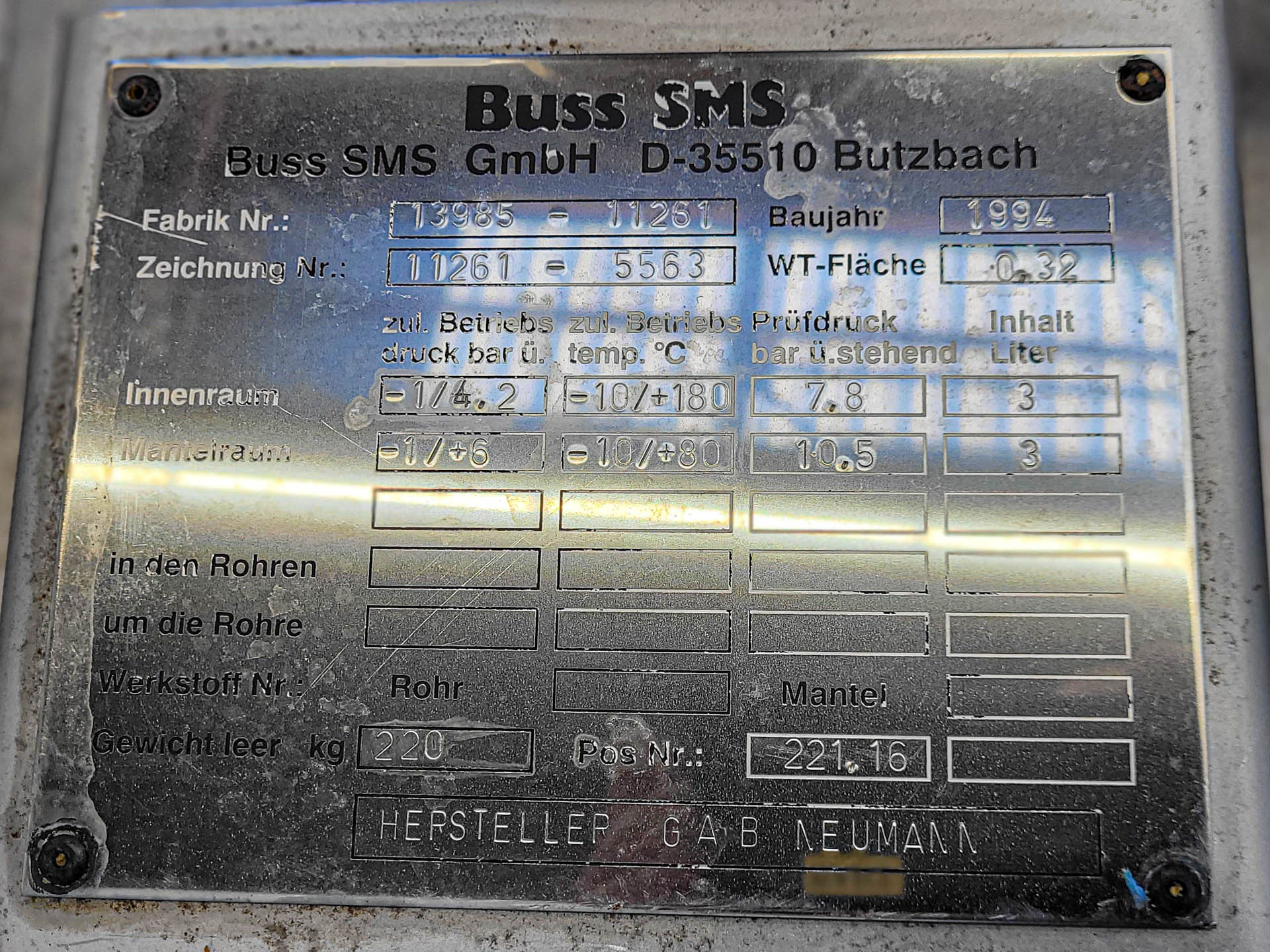 General SKU212T519 MakeBuss SMS/ GAB Neumann No.13985-11261 Year of construction1994 LocationBarneveld Pressure Vacuum possiblecheck Working pressure shell6 Bar Vacuum possible shellcheck Working pressure tubes4.2 Bar Tubular vacuum possiblecheck Main Features Shell (Material)Graphite Tube (Material)Graphite Surface0.32 m2 Specified Features - Shell and tube heat exchanger MaterialGraphite Heat exchangercheck Heating surface0,32 m² Tube capacity3 Ltr. Max. temperature-10/180 °C Shell capacity3 Ltr. Max. temperature-10/80 °C Information Floorspace0,6x0,6 m Total height0,7 m Weight240 KgCatalysts & fillersFeed additivesPaper & otherSolventsDetergent & surf.Other pharmaceuticsCosmeticsOrganicsE-waste & metalFood additivesSugarLubricants & oleoDairyAnimal feedOther feedConfectionerySolid pharmaceuticsBeveragesDyes & pigmentsBiopharmaceuticalAPIPlastic & rubberM ...