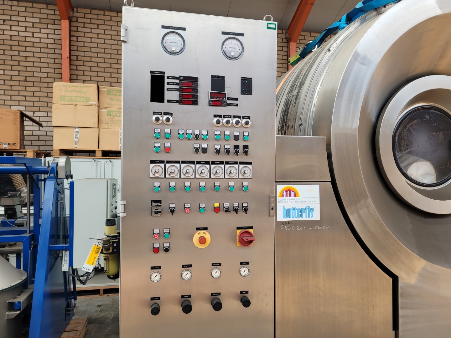 General SKU043E201 MakeHüttlin Coating-Technik GmbH Steinen TypeButterfly HB-750 No.HUE-100794 Year of construction1994 Mounted on framecheck Main Features MaterialStainless steel Motor7.5 KW Inlet diameter2070 mm Specified Features - Coating pan MaterialStainless steel 1.4301 (304) Coating installationFilm coating line (1x) Batch size200-600 KG Pan diameter2070mm Pan depth1560mm In-/Outletdia. 700mm Motor± 9,2 KW, 400 Volt With frequency controllercheck Pan speed± 1,5-15 Rpm With electric heatingcheck (210 KW) With fancheck (2x) Motor7,5 KW, 380 Volt + 15,0 KW, 400/690 Volt With air filtercheck (2x) DCE Unimaster, Type UMA-454 V With spraying armcheck With dosing pumpcheck make Walther Trowal Information LocationBarneveld With switchgearcheck Floorspace3,7x2,3 m Total height3,2 m Weight5000 kgDiscountCoating pansHuettlinDiscountCoating pans > Coating ...