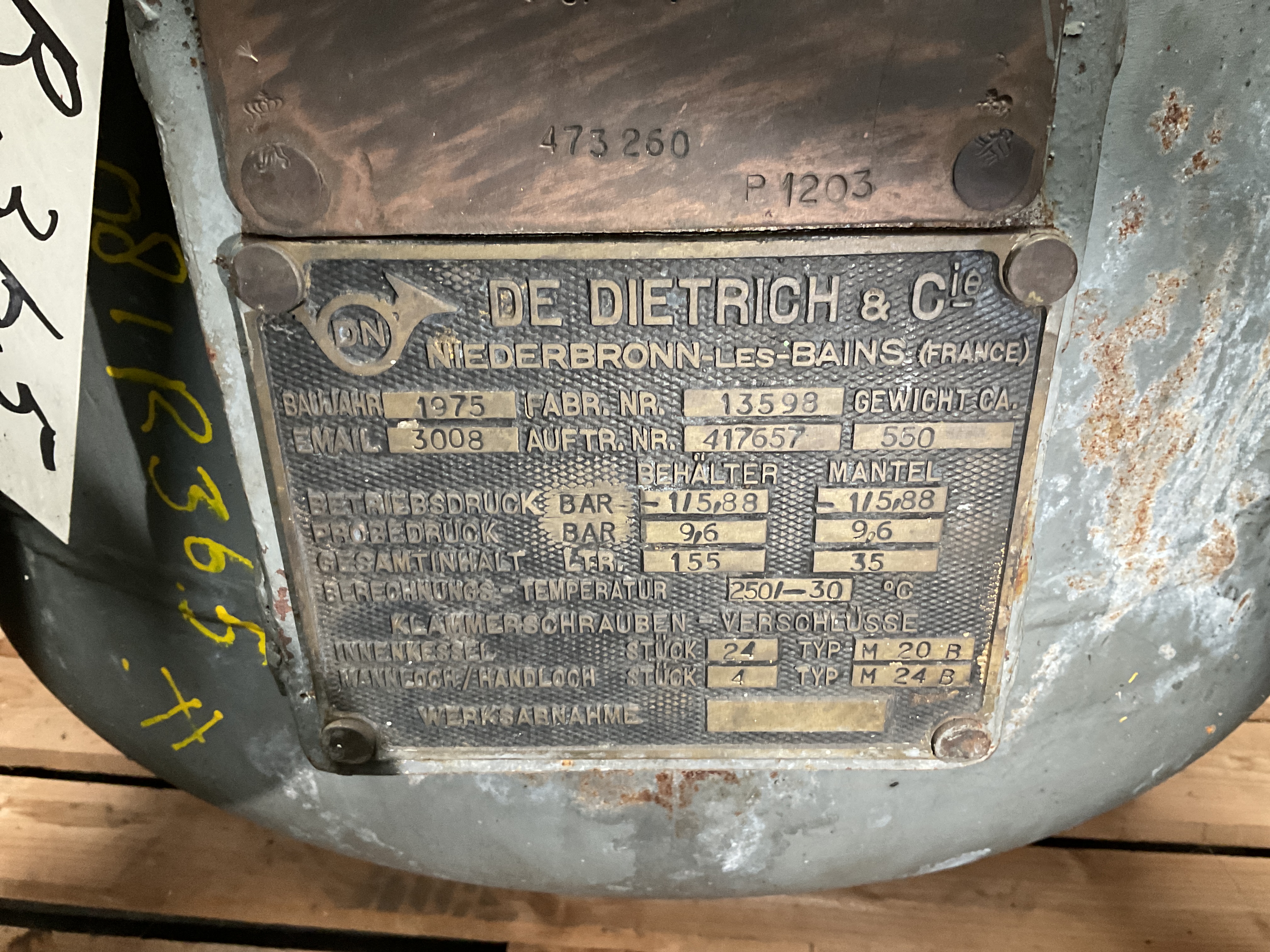 General SKU081R365 MakeDe Dietrich TypeSTA-100 No.13598 Year of construction1975 LocationBarneveld Material Lining materialGlass - Enamel (3008) Pressure Working pressure5.88 Bar Vacuum possiblecheck Working pressure jacket5.88 Bar Vacuum possible jacketcheck Main Features MaterialGlass Volume155 Ltr. Specified Features - Glass-lined Reactor Reactor(1x) Capacity155 Ltr. Dished bottomcheck Dished top sidecheck Top connections2x Dia. 40mm/1x 50mm/1x 90mm OutletDia. 80mm With jacket(35 Ltr.) Max. temperature-25/+250 Dgr.C. With propellor stirrercheck Without motorcheck Information FloorspaceDia. 1,0 M Total height1,7 M Weight600 Kg Technical specs Extra informationcheckCatalysts & fillersSolventsDiscountDetergent & surf.Other pharmaceuticsCosmeticsLubricants & oleoSolid pharmaceuticsDyes & pigmentsAPIGlass-lined ReactorsAgrochemicalsBiotechnologyOther chemi ...