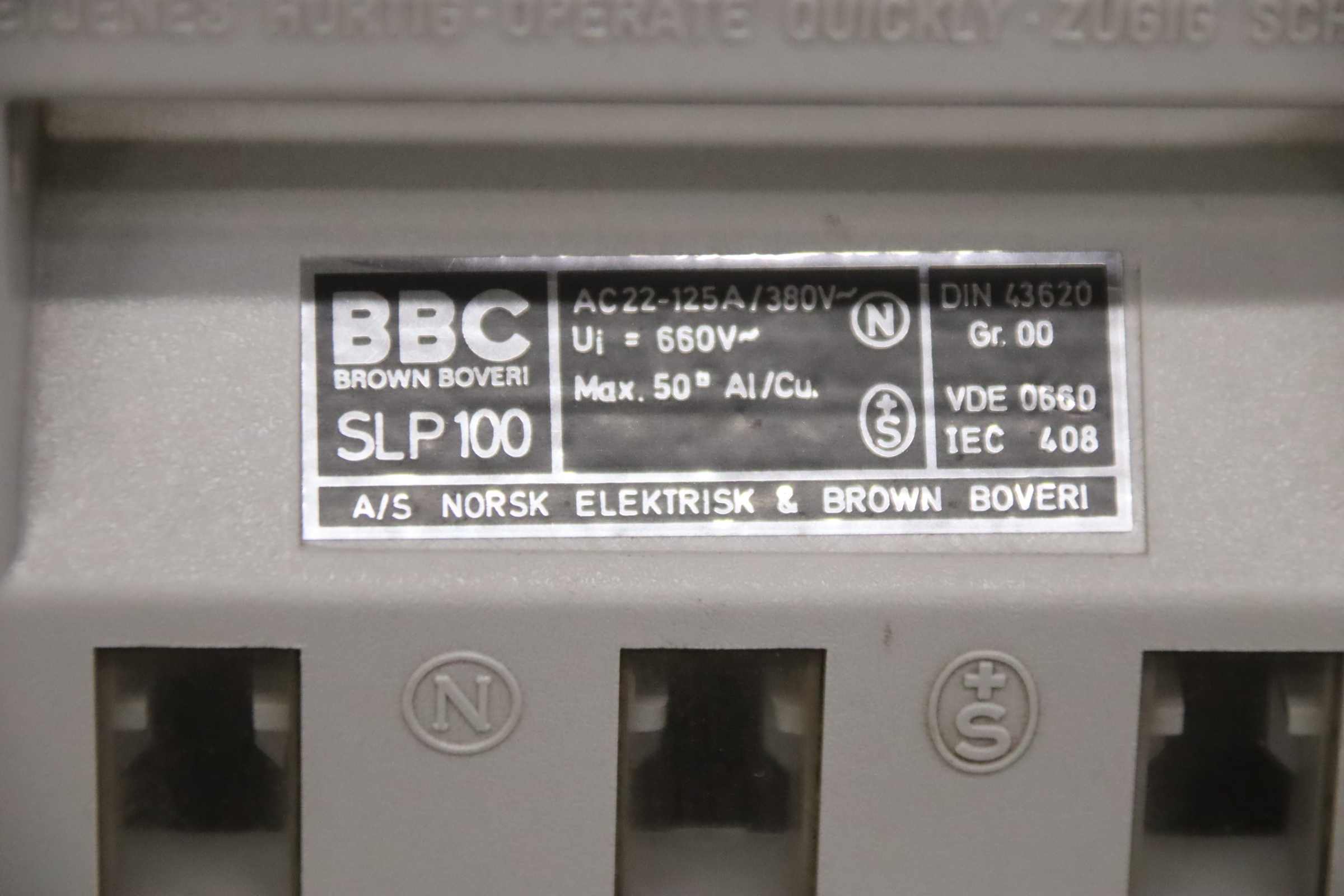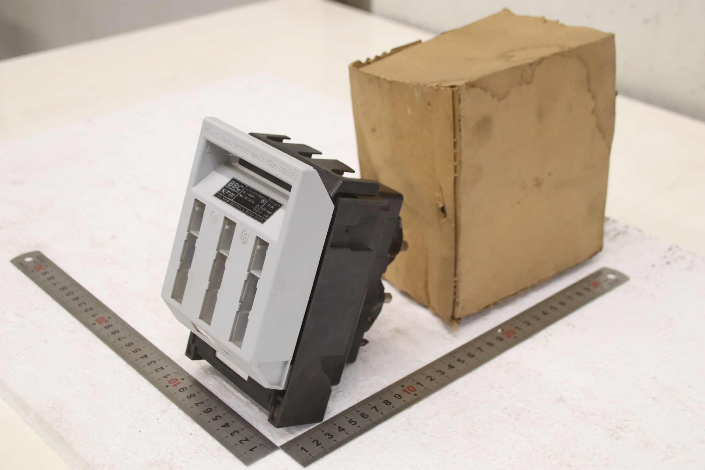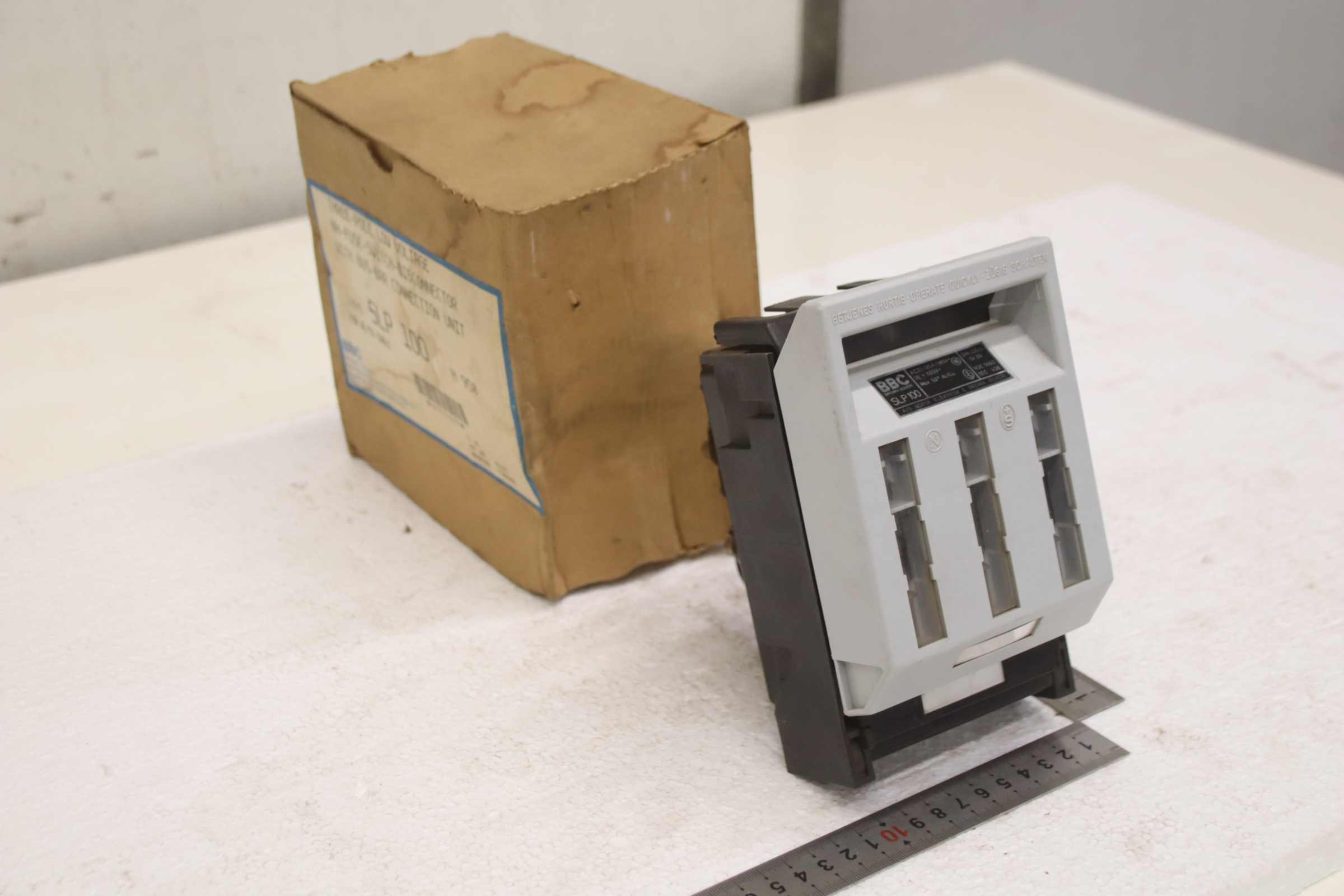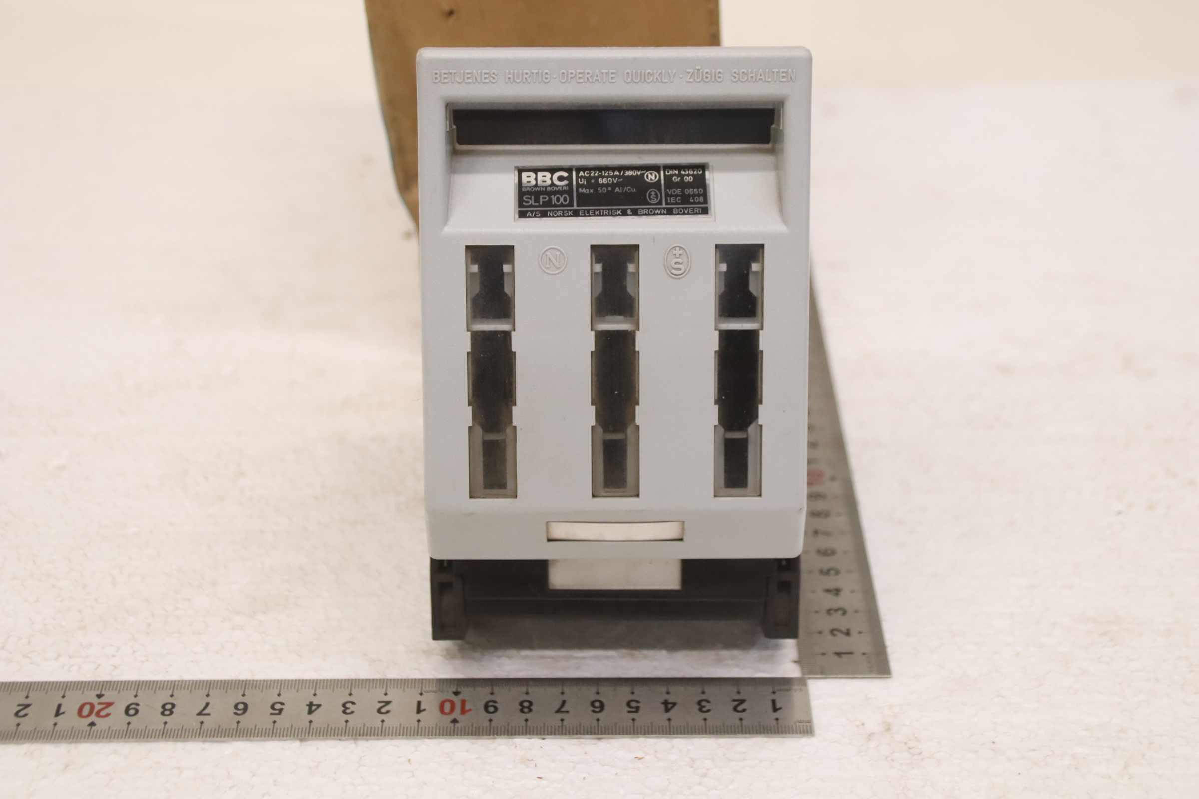 Auxiliary circuit breaker, circuit breaker, miniature circuit breaker, load break switch, load disconnector, power switch, power disconnector, auxiliary switch, main switch, disconnector, fuse-switch disconnector -Manufacturer: BBC, fuse-switch disconnector, circuit breaker 125 A, unused, original packaging -Type: SLP 100 -Quantity: 1x load break switch available -Cardboard dimensions: 170/110/H180 mm -Weight: 1.0 kg/piece