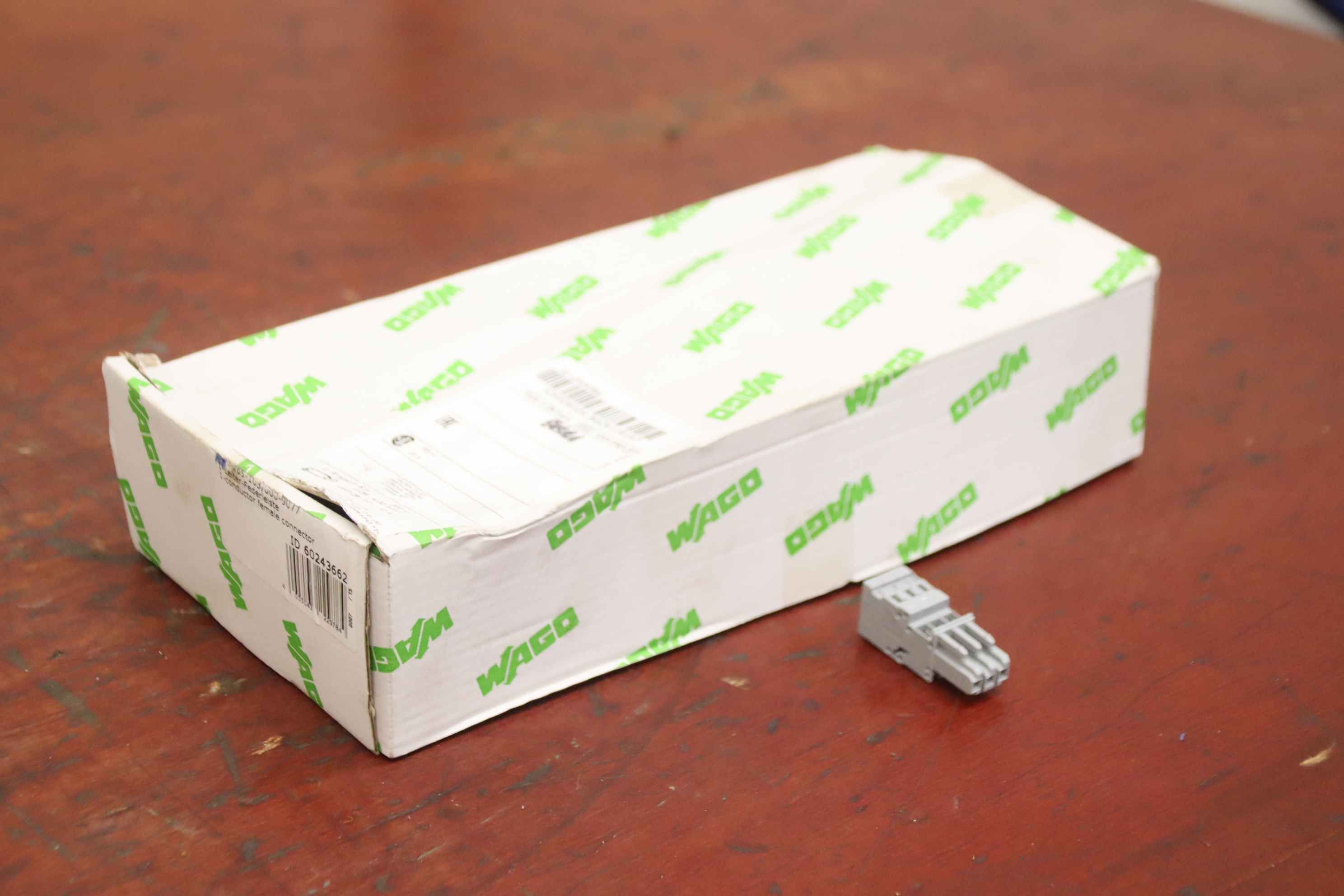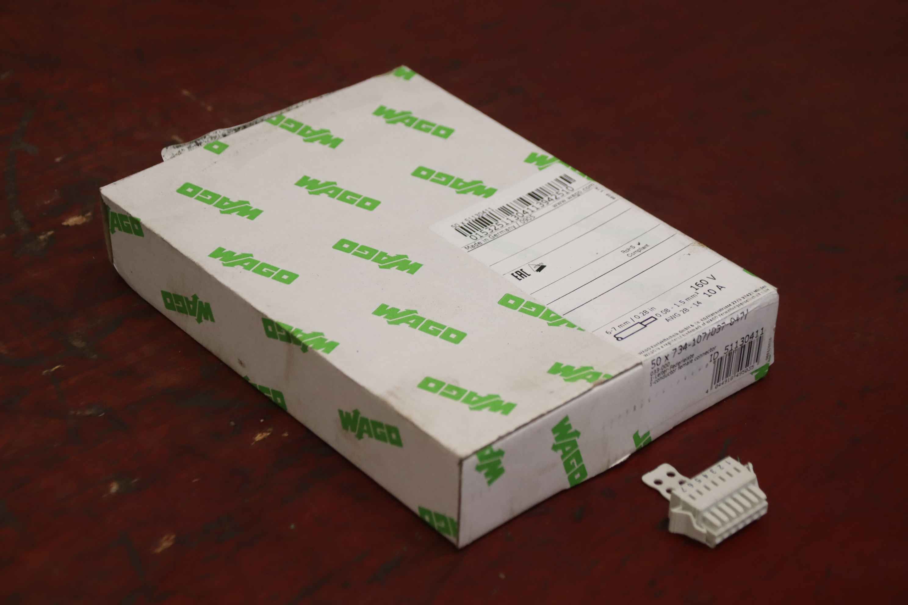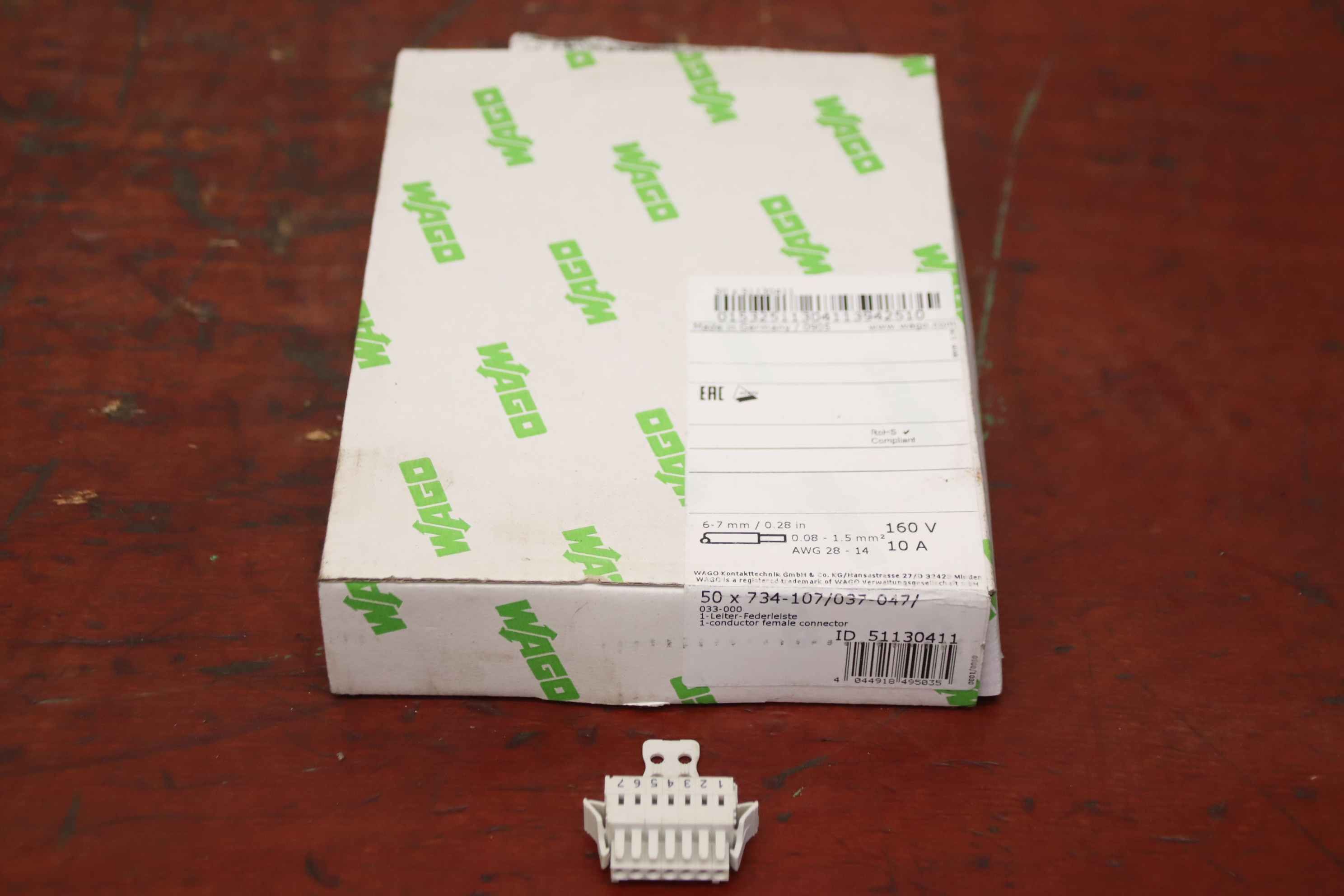 Connectors, plugs, 1-wire female connector,-Manufacturer: Wago, 1-conductor female connector Box with 50 pieces-Type: 734-107/037-047/ 7-pin-Quantity: 7x box available-Price: per box-Dimensions box: 200/145/H40 mm-Weight: 0.4 kg/carton