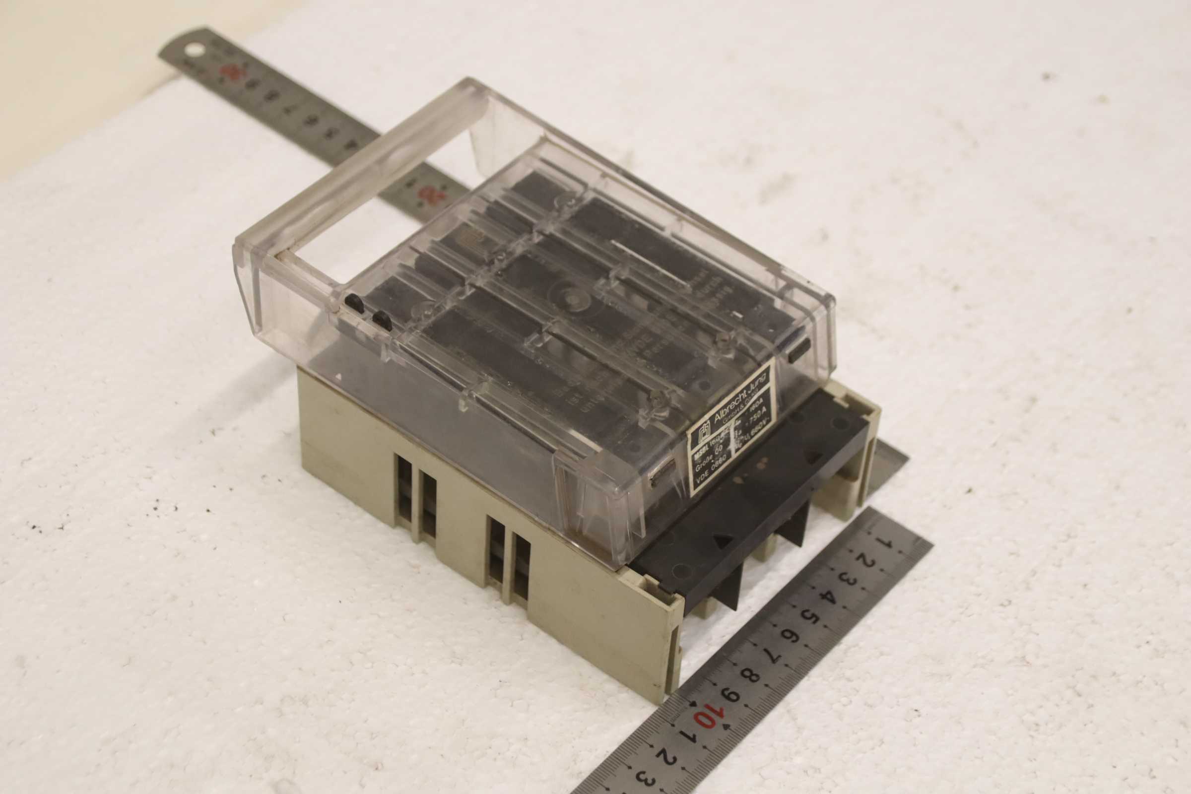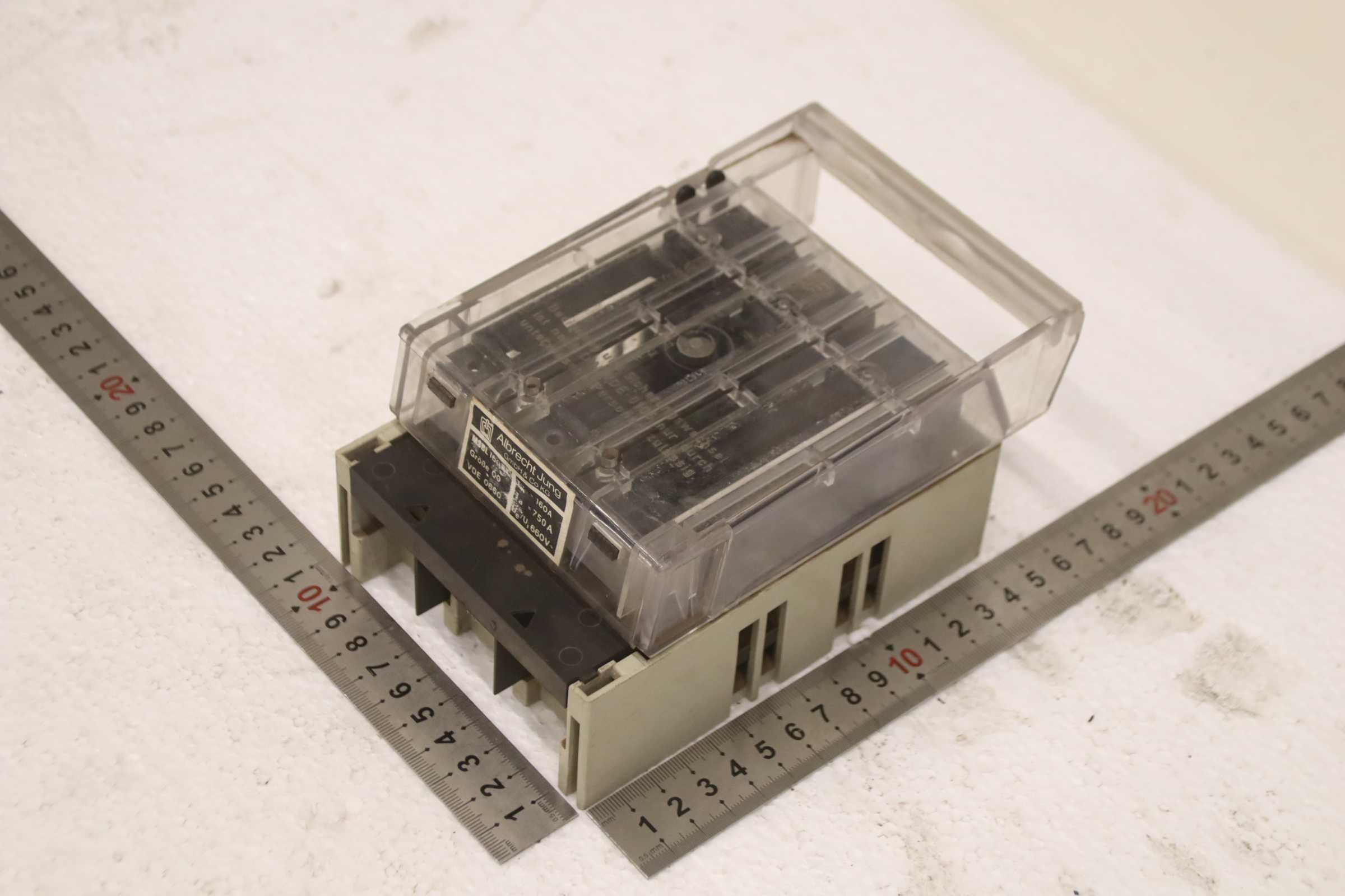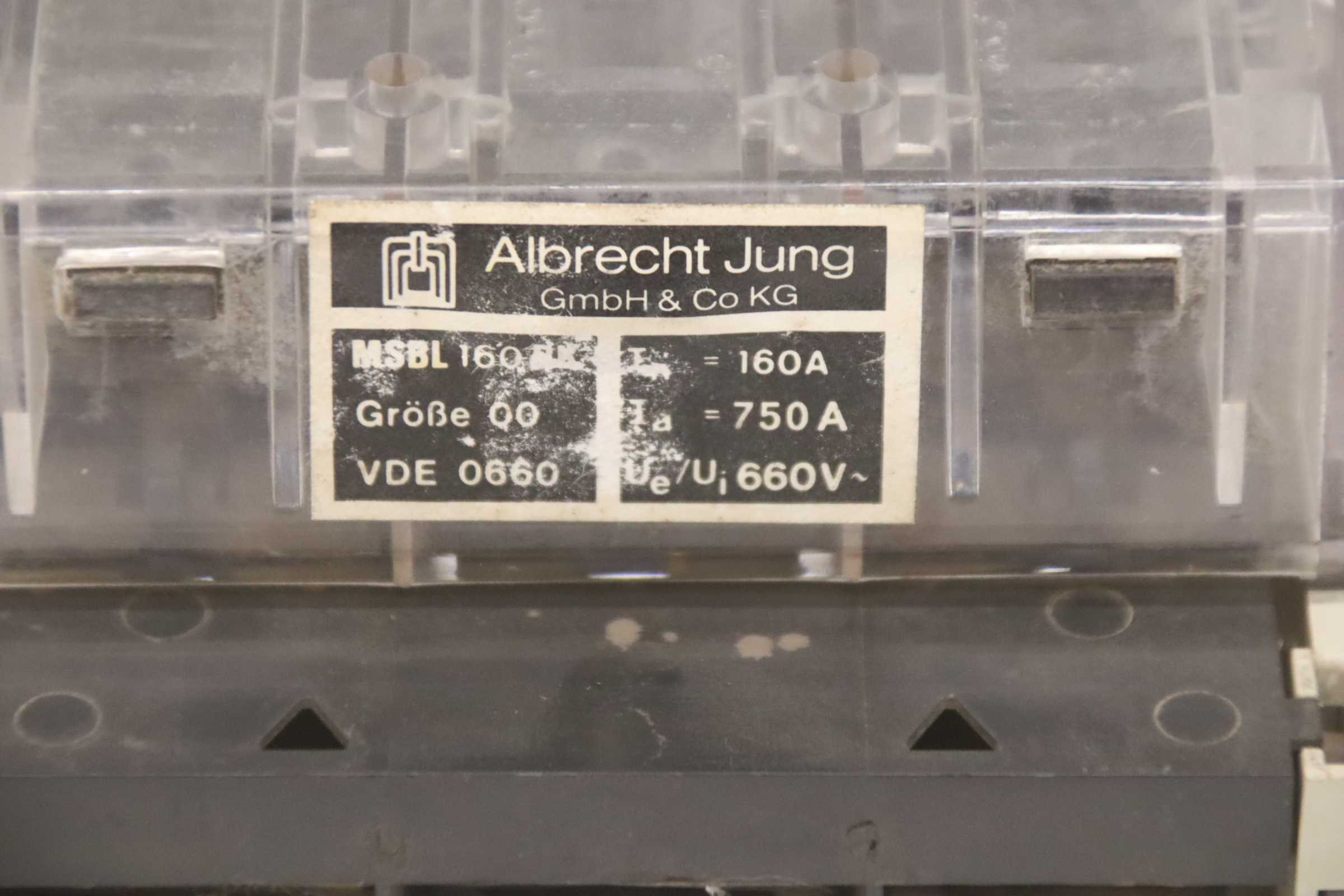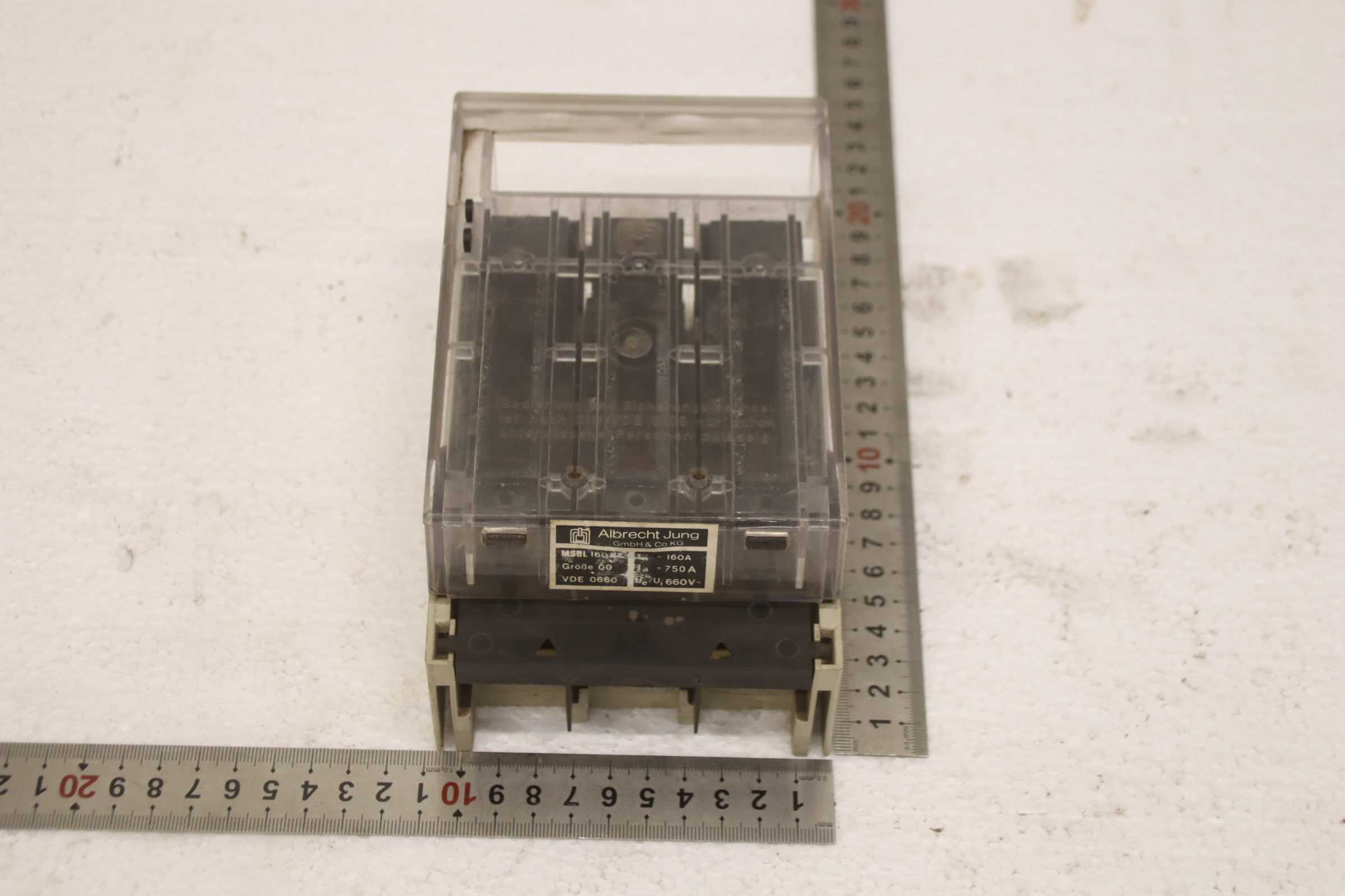 Auxiliary circuit breaker, circuit breaker, miniature circuit breaker, load break switch, load disconnector, power switch, power disconnector, auxiliary switch, main switch, disconnector, fuse-switch disconnector, NH fuse-switch disconnector -Manufacturer: Albrecht Jung, NH fuse switch disconnector 160 A -Type: MSBL 160 -Quantity: 1x load break switch available -Dimensions: 170/105/H85 mm -Weight: 0.7 kg/piece