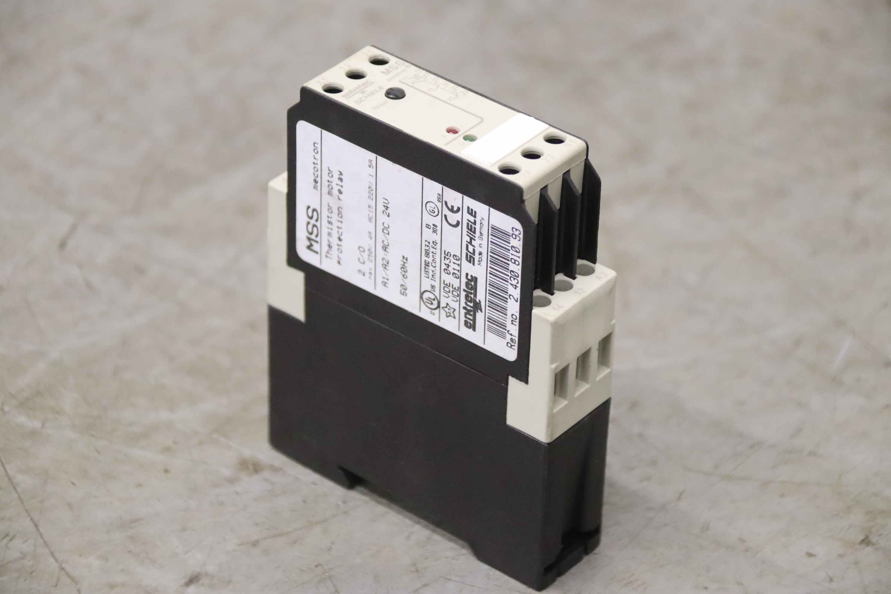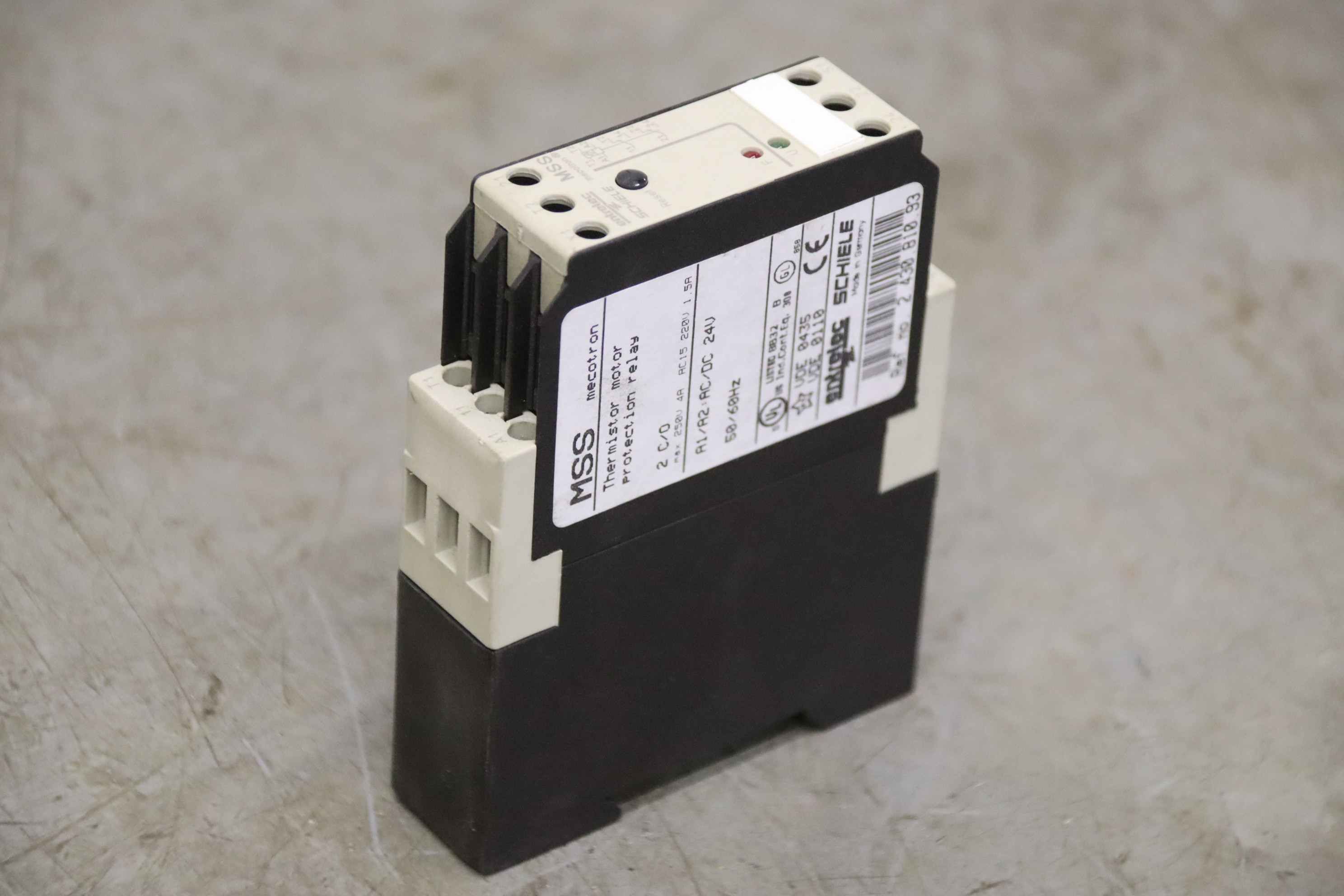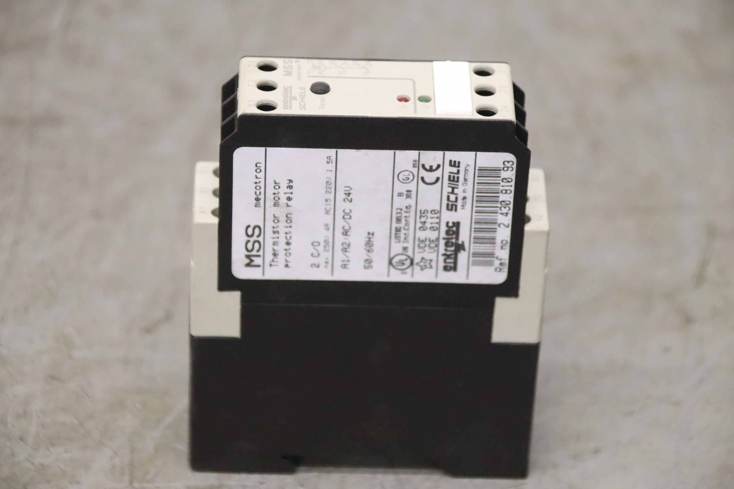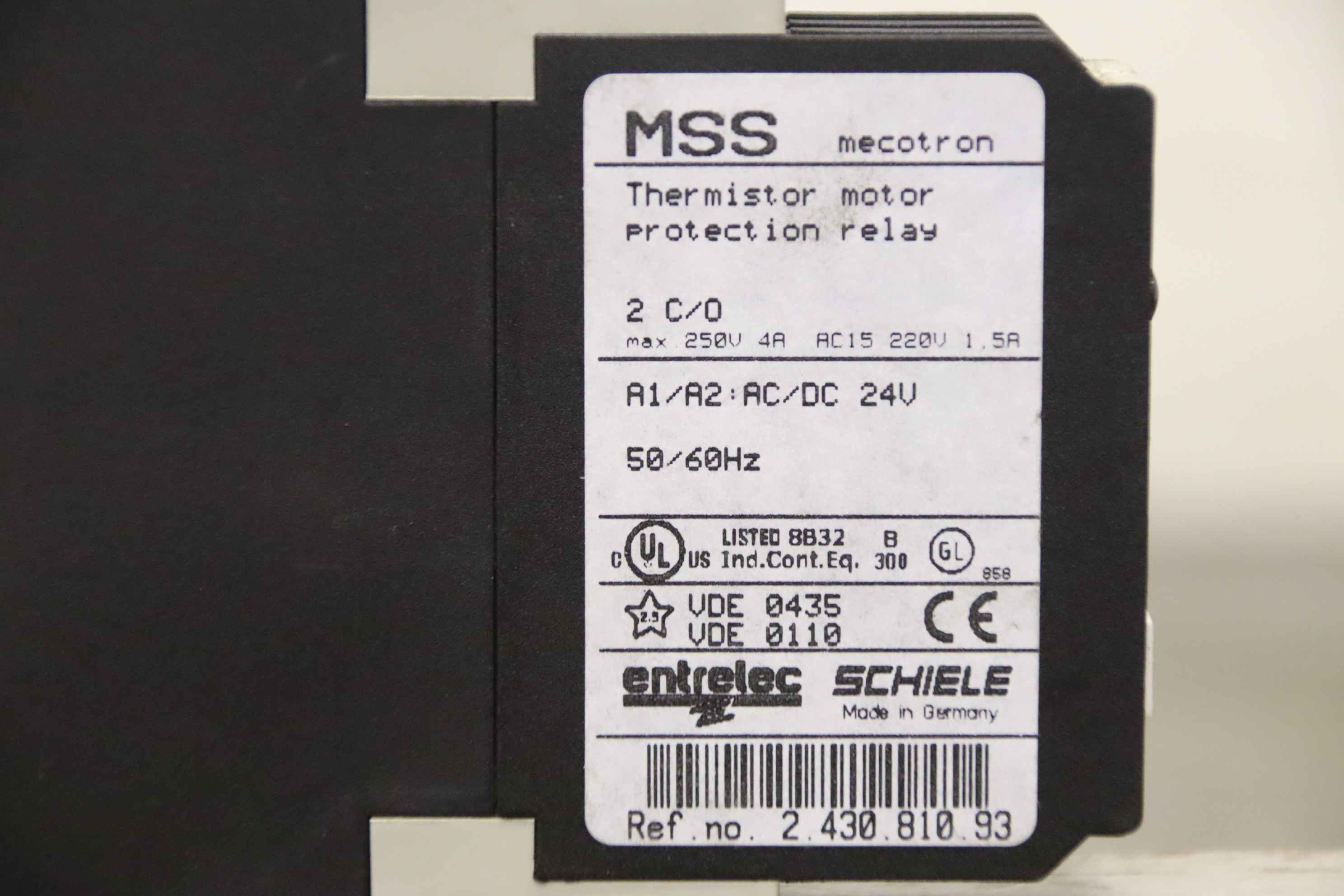 Motor protection relay, relay, heating current monitoring, preheating for generators, contactor, semiconductor contactor, contactor, motor protection, monitoring relay, thermistor-Manufacturer: Schiele, motor protection relay MSS mecotron 2 C/O unused in original packaging-Article number: 2.430.810.93-Voltage: max. 250 V / A1/A2: AC/DC 24V-Quantity: 17x relays available-Price per piece-Dimensions packaging: 80/25/H100 mm-Weight: 0.1 kg/pc.