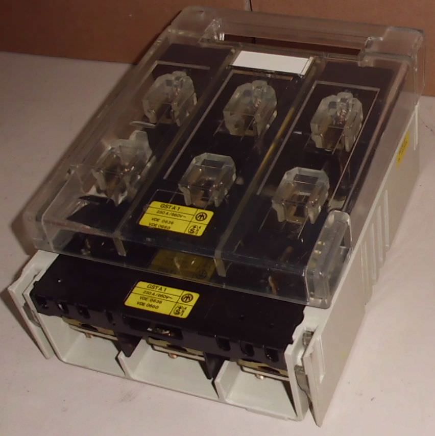 NH fuse-switch disconnectors, auxiliary circuit breakers, line switches, miniature circuit breakers, load break switches, load disconnectors, circuit breakers, power disconnectors, auxiliary switches, main switches, disconnectors, fuse-switch disconnectors, fuse-switch disconnectors -Manufacturer: Klöckner Moeller, NH fuse switch disconnector 250 A, unused, original packaging -Type: GSTA1 -Technical data: 250 A 660 V 3-pole IP 00 -Number: 15x NH fuse-switch disconnectors available -Price: per piece -Cardboard dimensions: 180/260/H115 mm / 250/190/H125 mm -Weight: 3.5 kg / 2.7 kg